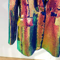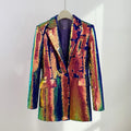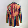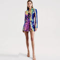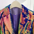 Brilla en cualquier evento con este impresionante vestido blazer de nuevo diseño para mujer, con un elegante cuello de solapa y cierre de un solo botón. La chaqueta está bellamente adornada con vibrantes y coloridas lentejuelas en un azul brillante, lo que la convierte en la prenda perfecta para fiestas, clubes u ocasiones especiales. Con su corte entallado y su llamativo brillo, este vestido blazer largo combina a la perfección elegancia y un estilo audaz.