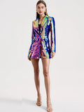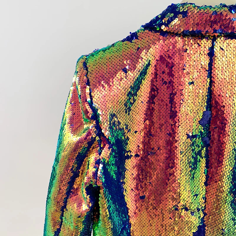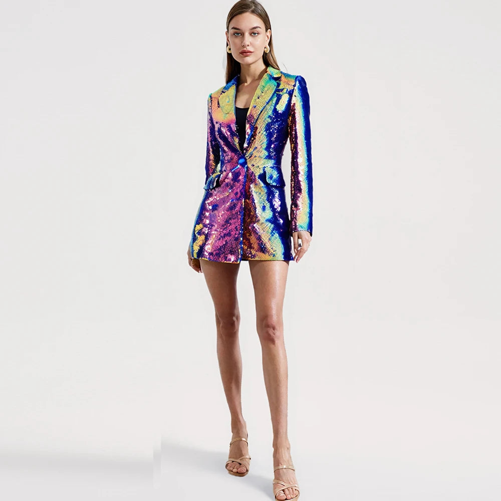 Nuevo diseño de chaqueta de vestir para mujer, con un solo botón, cuello de solapa, lentejuelas de colores azules brillantes, chaqueta larga para fiesta y club.