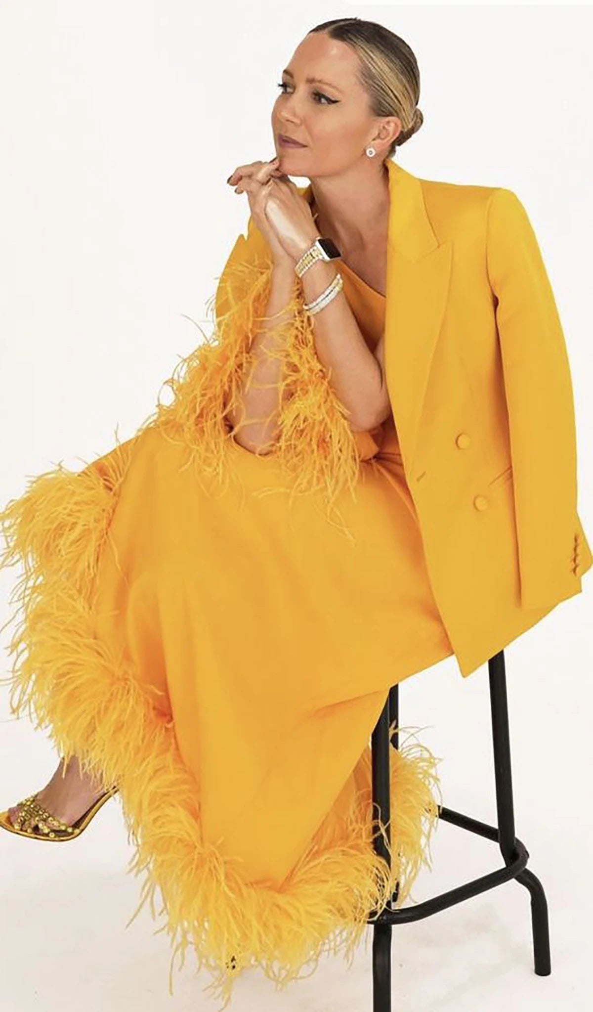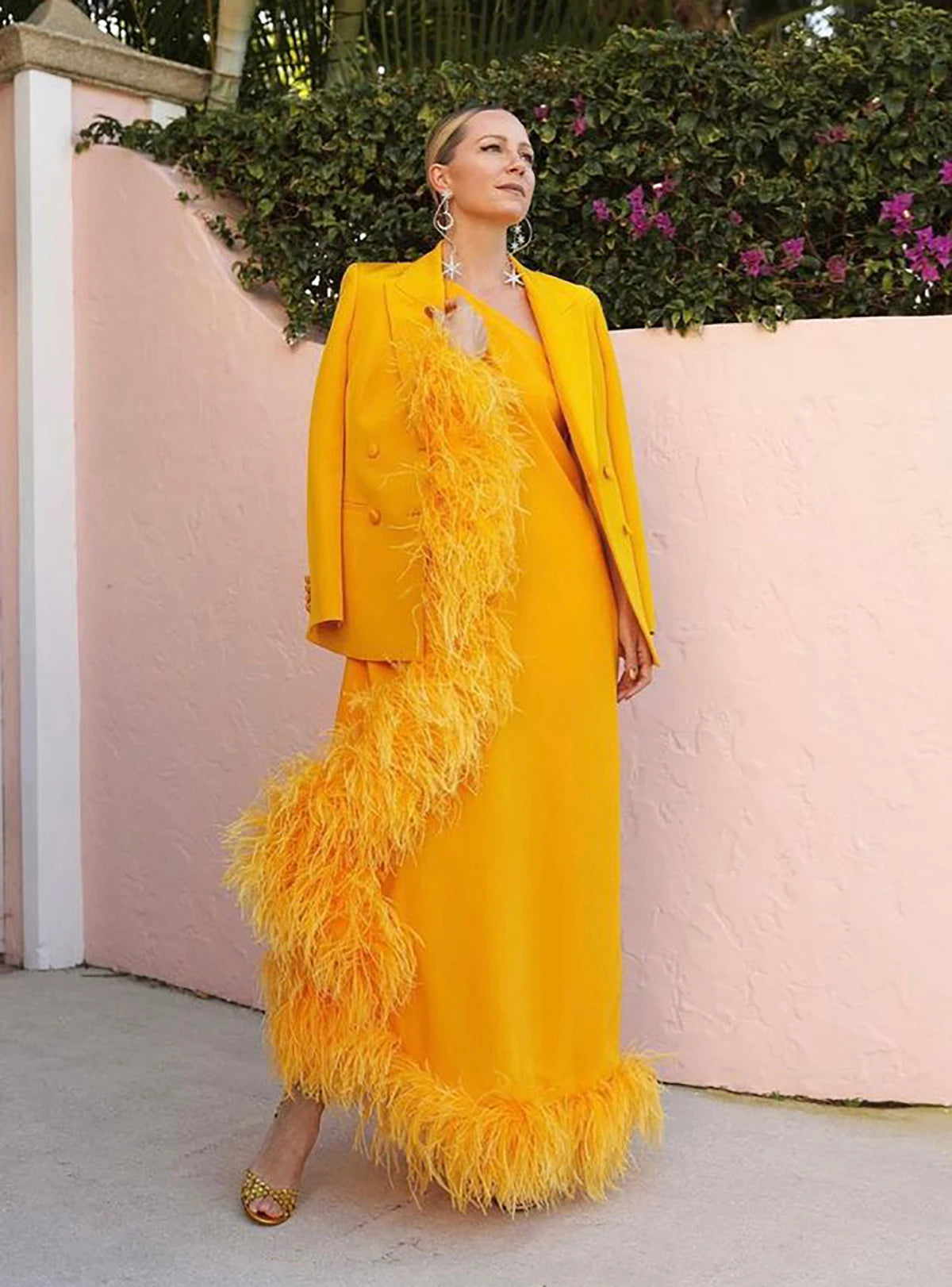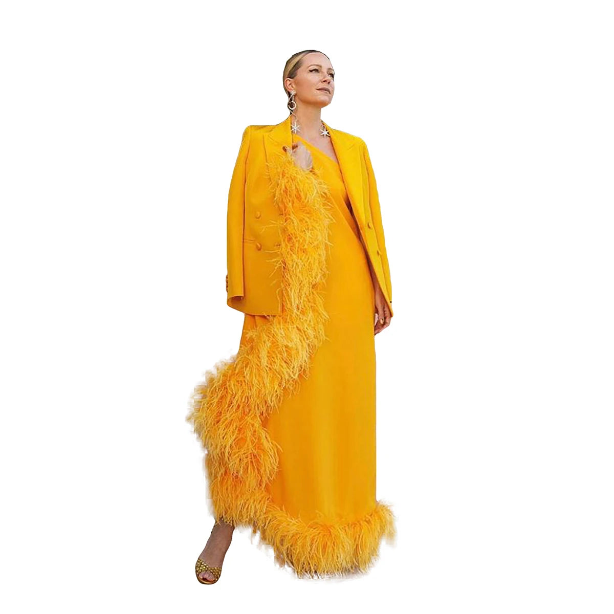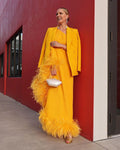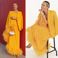 Nuevo diseño de trajes de mujer, 2 piezas, vestido de noche con plumas de un solo hombro y blazer, vestido de invitada de boda personalizado, traje de cóctel