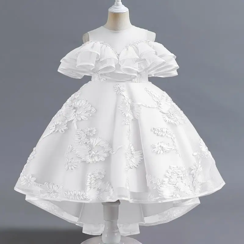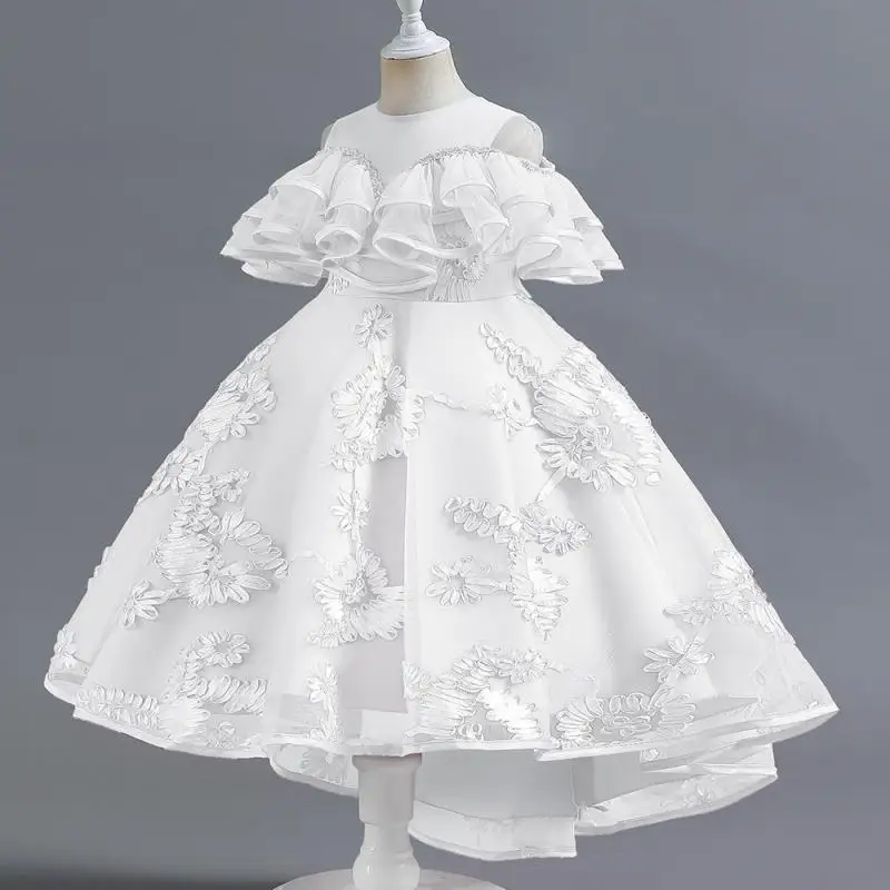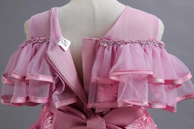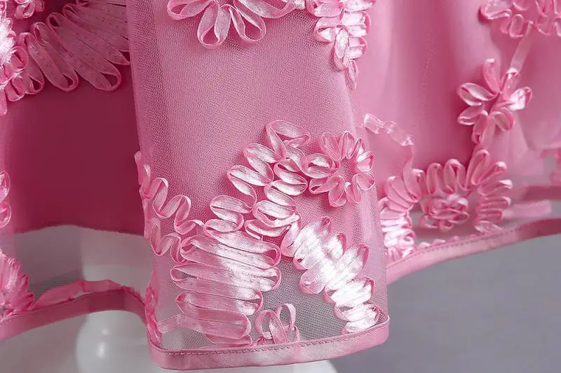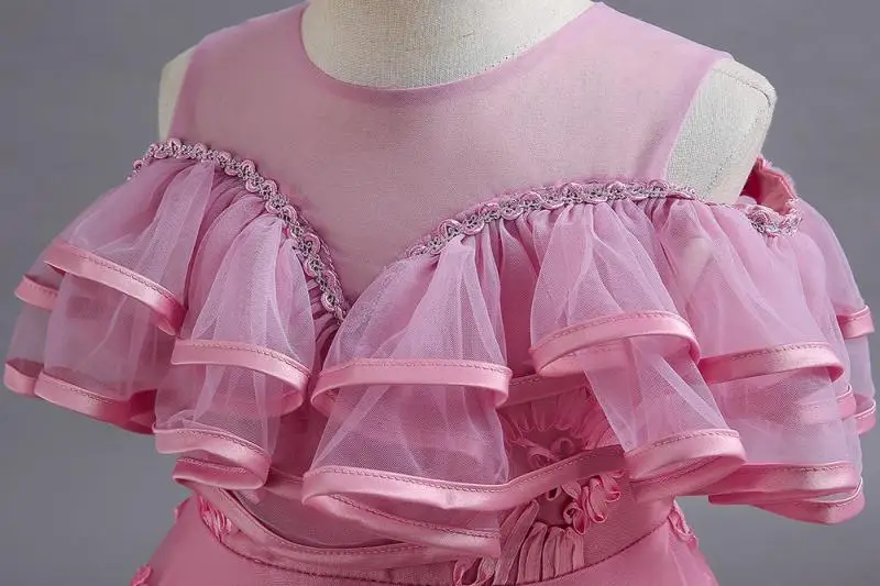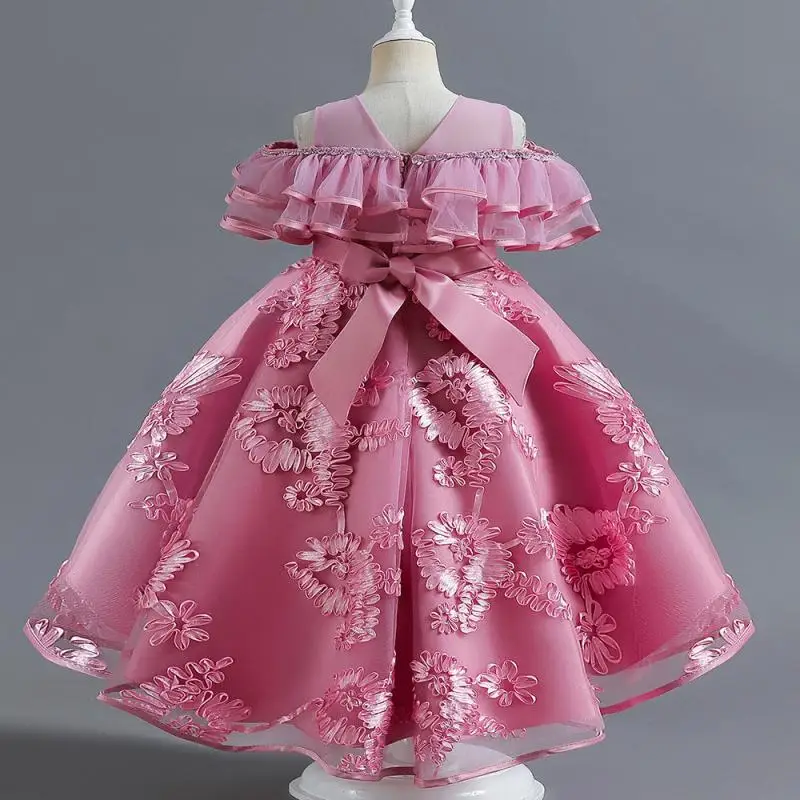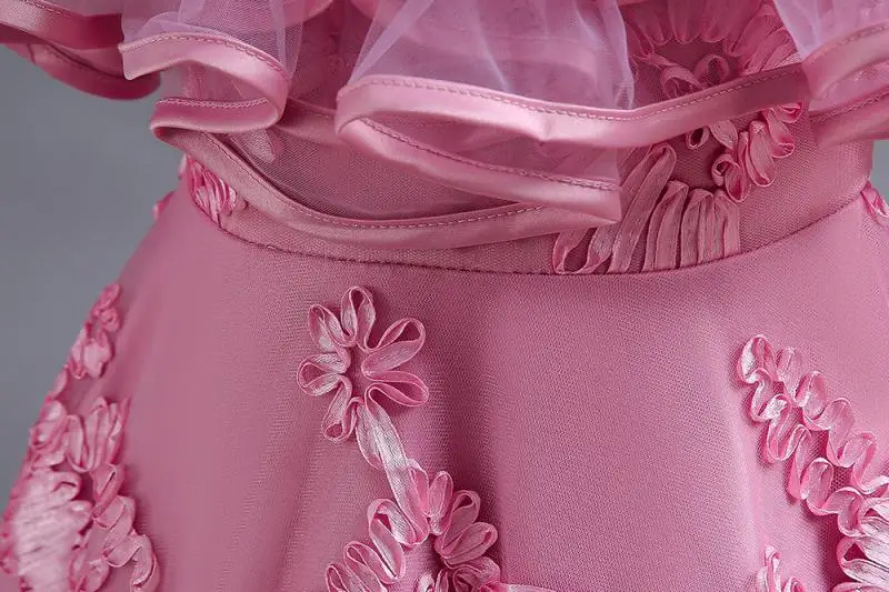 Vestido de fiesta alto-bajo sin mangas con volantes y bordado floral rosa para niñas