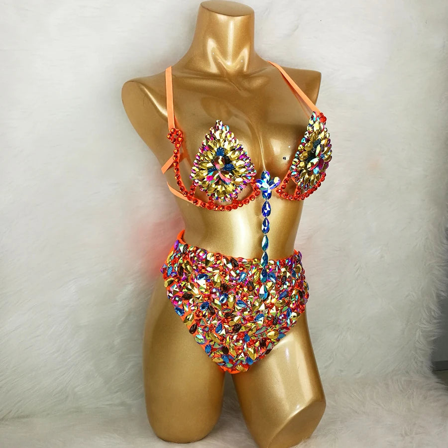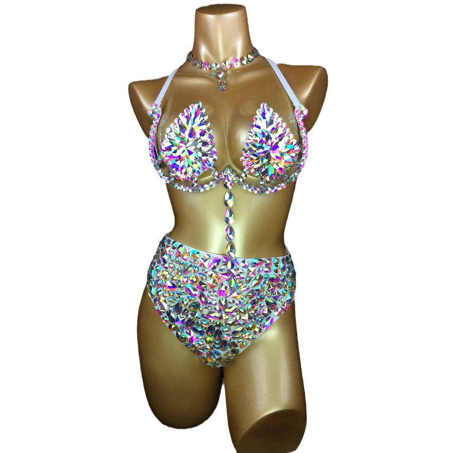 Nuevo disfraz de carnaval de samba para mujer, sujetador de alambre sexy, top y pantalones de cintura alta, conjunto de 2 piezas, piedra de color AB para fiestas, bailes, clubwear