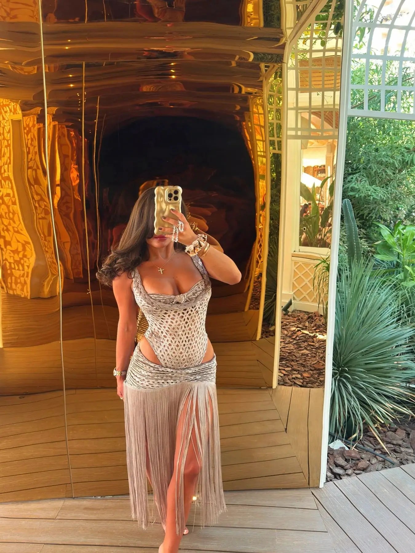 Falda de dos piezas con borlas de encaje para mujer, traje de punto trenzado, sin mangas, cintura dulce, elegante, con abertura, maxifalda de verano