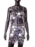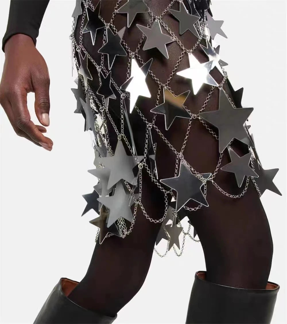 Dazzle the crowd in this Silver Star Metal Chain Splice Body featuring sexy hollow designs and dazzling mirror sequins. Perfect for nightclub parties or performance displays, this unique bikini chain outfit combines striking silver star accents and a bold, openwork silhouette. Shimmering mirror sequins and intricate metal chains reflect the light as you move, ensuring all eyes are on you. Ideal for performers, dancers, or anyone wanting to make a show-stopping entrance at special nightlife events