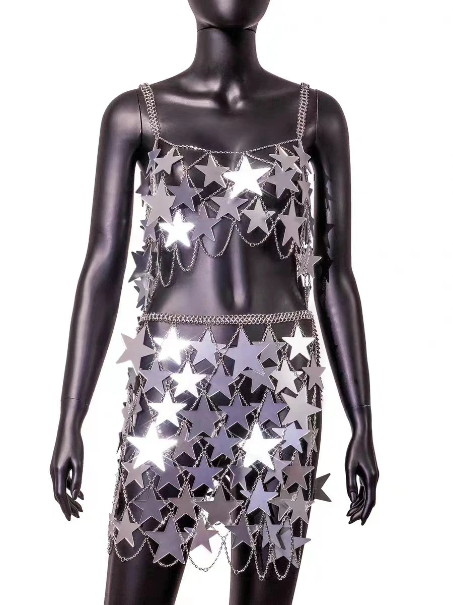 Nightclub Party Display Clothing Silver Star Metal Chain Splice Body Sexy Hollow Mirror Sequin Bikini Chain
