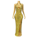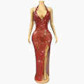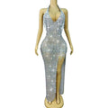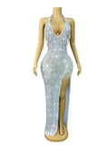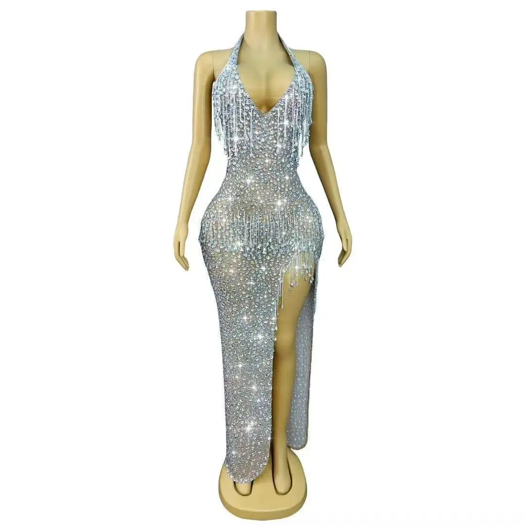 Nude Blue Red Black Rhinestones Crystals Chain Heavy Luxury Gowns Sexy V-neck Backless Dress Women Party Photoshoot Stage Wear