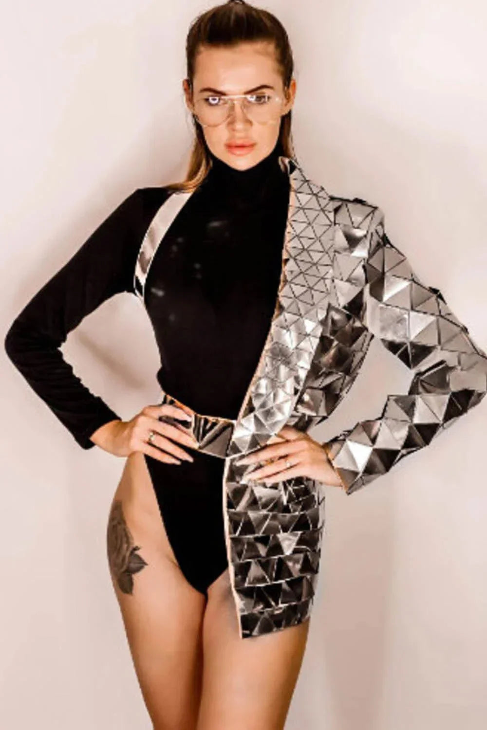 Chaqueta de lentejuelas geométricas de una manga - Abrigo de vendaje dorado - Chaqueta de noche para discoteca - Prenda exterior asimétrica de moda