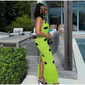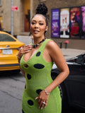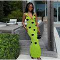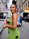 Embrace chic sophistication with this Dot Contrast Green Knitted Long Dress. Crafted in a soft, elegant knit, this sleeveless robe features a classic O-neck and eye-catching contrast polka dots for a fashion-forward look. The tassel hem brings a playful, stylish touch, making it perfect for high street outings or upscale occasions. Step out in this new-season favorite and enjoy a flattering, effortlessly elegant silhouette that defines modern women’s fashion.