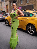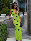 Dot Contrast Green Knitted Long Dress Chic Women's O Neck Sleeveless Tassles Hem Robes New Elegant High Street Wear
