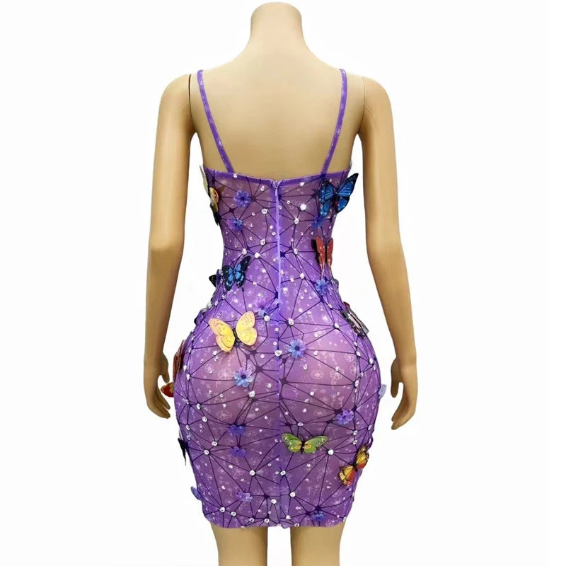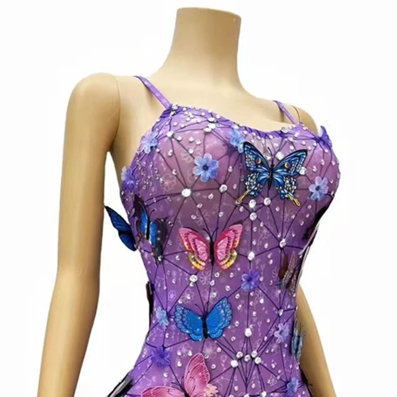 A show‑stopping Purple Butterfly Rhinestones Dress designed for singers, jazz dancers, festival performers, and party appearances. This dramatic stage dress combines a vibrant purple palette, butterfly motif, and hand‑applied rhinestones to create captivating movement and reflective sparkle under stage lights and cameras.