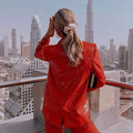 Traje de pantalón con lentejuelas rojas para mujer, conjunto de chaqueta y pantalón, informal, formal y de fiesta.