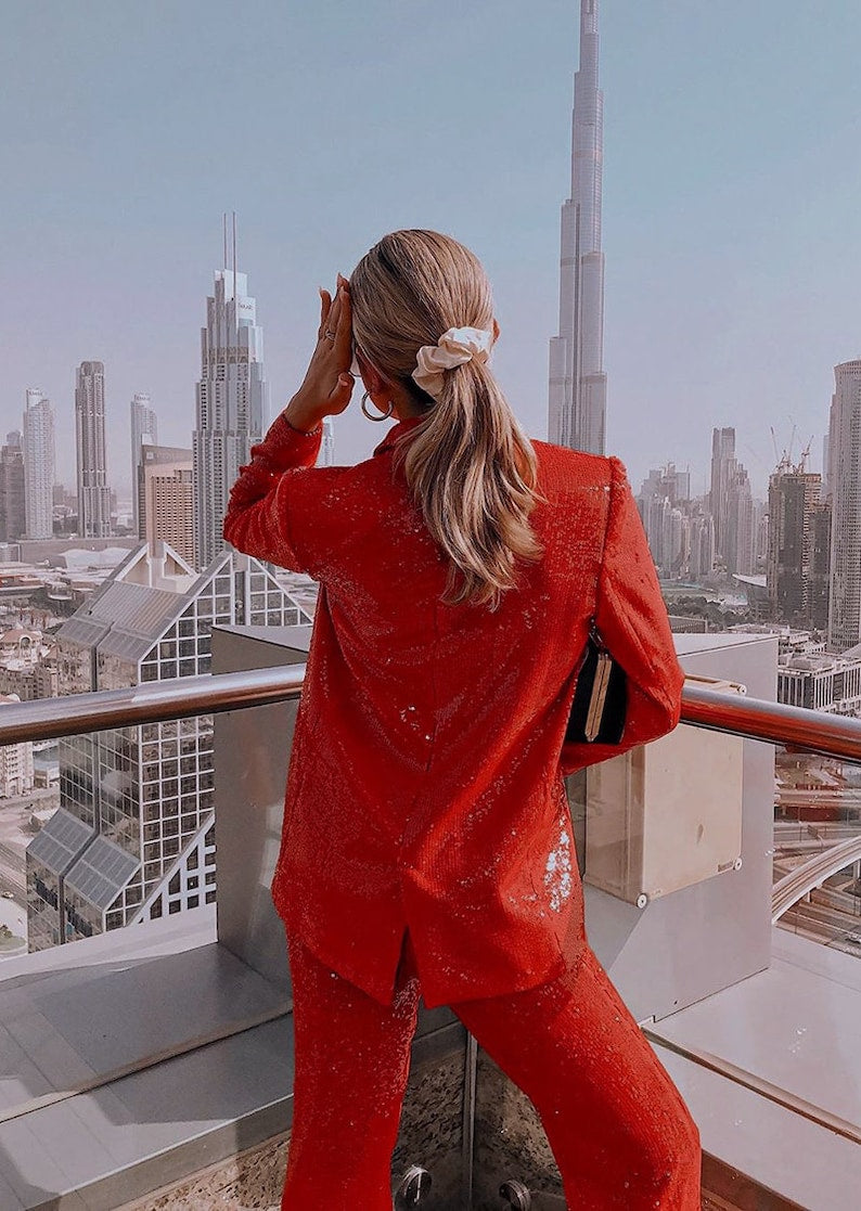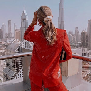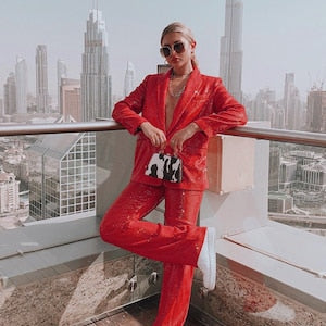 El traje de pantalón con lentejuelas rojas es un impresionante conjunto de diseñador que incluye una chaqueta brillante y pantalones a juego. Este versátil conjunto es perfecto tanto para ocasiones informales como formales, lo que lo convierte en el regalo ideal para cualquier mujer que quiera destacar.