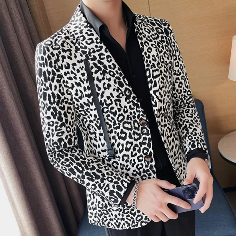 Este blazer para hombre con estampado de leopardo retro es una chaqueta de traje de inspiración británica, perfecta para un estilo vintage informal. Su diseño entallado transmite una elegancia atemporal, ideal para el día a día. Con su exclusivo estampado de leopardo, este blazer añade un toque de sofisticación a cualquier conjunto, convirtiéndolo en una prenda imprescindible para el hombre a la moda.
