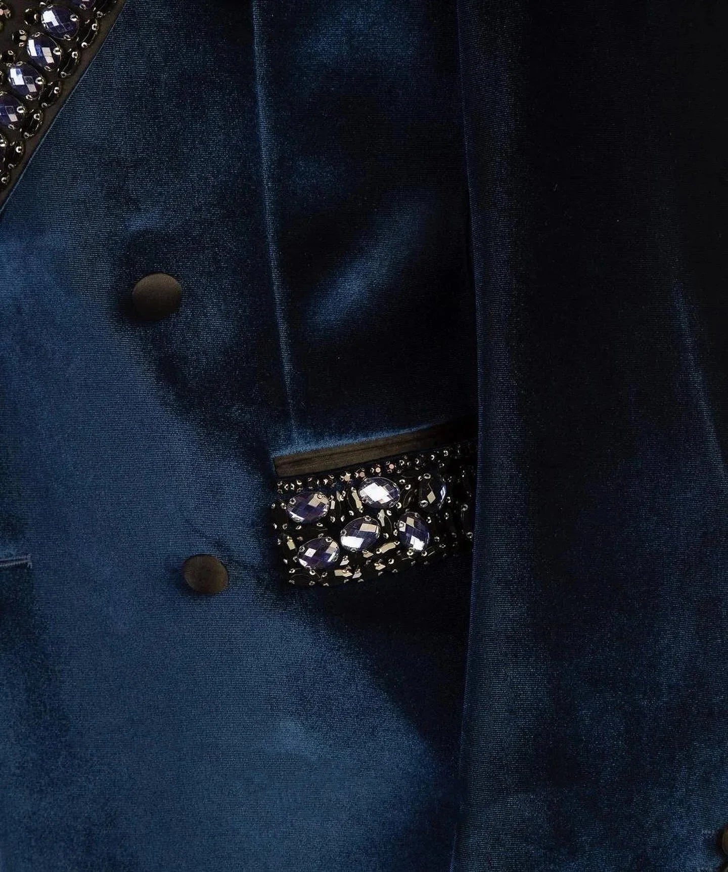 Make a bold, nostalgic statement with this Retro Men's Suit jacket — a single, show-stopping piece crafted for those who favor vintage glamour with modern tailoring. Designed as a customized jacket only (sold separately from pants), this double-breasted velvet blazer combines sumptuous fabric, sculpted structure, and dazzling rhinestone beading to create an unforgettable focal point for evening events, performances, weddings, and fashion-forward occasions.