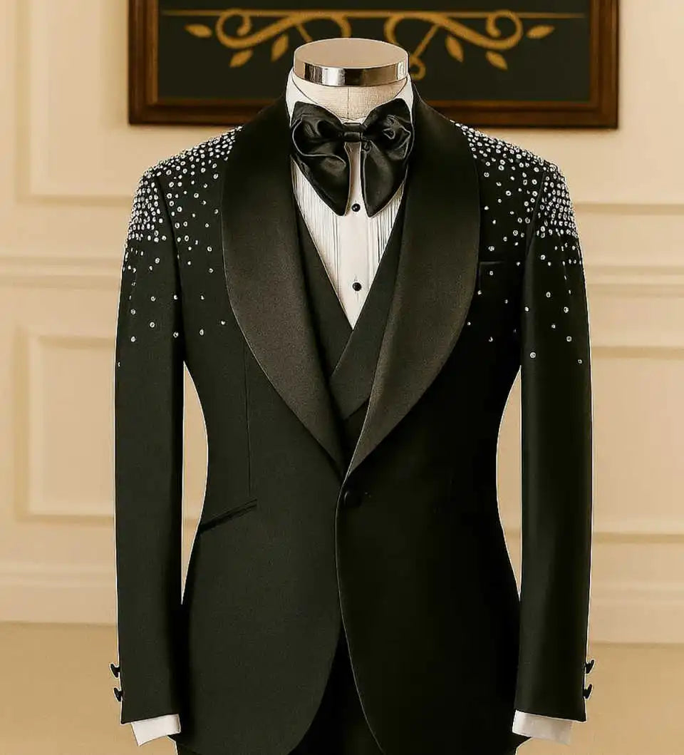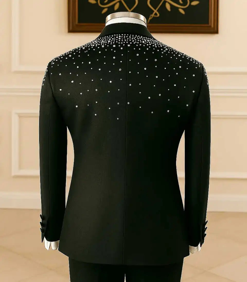 Elevate your wedding-day presence with this Rhinestone Luxurious Wedding Suit, designed for the modern groom who values classic tailoring with a touch of show-stopping detail. This single-breasted, two-piece tuxedo set—featuring a refined jacket and perfectly cut pants—combines sleek silhouettes with tasteful rhinestone embellishment to create a statement look for ceremonies, receptions, proms, and upscale parties.