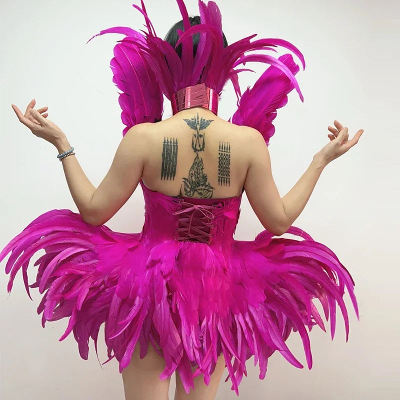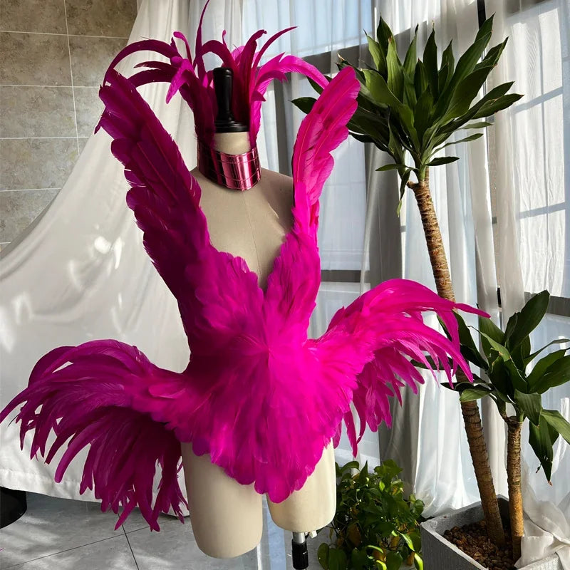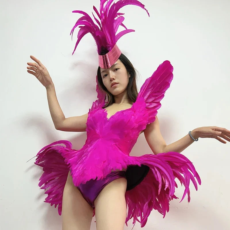 Ilumina el escenario con este deslumbrante body de plumas rojo rosa y su sombrero a juego, diseñado para mujeres que aman actuar y llamar la atención. Adornado con glamurosas plumas y confeccionado con una silueta audaz, este disfraz es ideal para cantantes, gogos, DJs de discotecas, artistas de DS y pole dance. Su llamativo color rojo rosa y sus detalles impactantes te garantizan confianza y energía en raves, bares y fiestas. Causa una gran impresión y deja que tu actuación hable por sí sola con este inolvidable atuendo para el escenario y la rave.