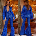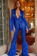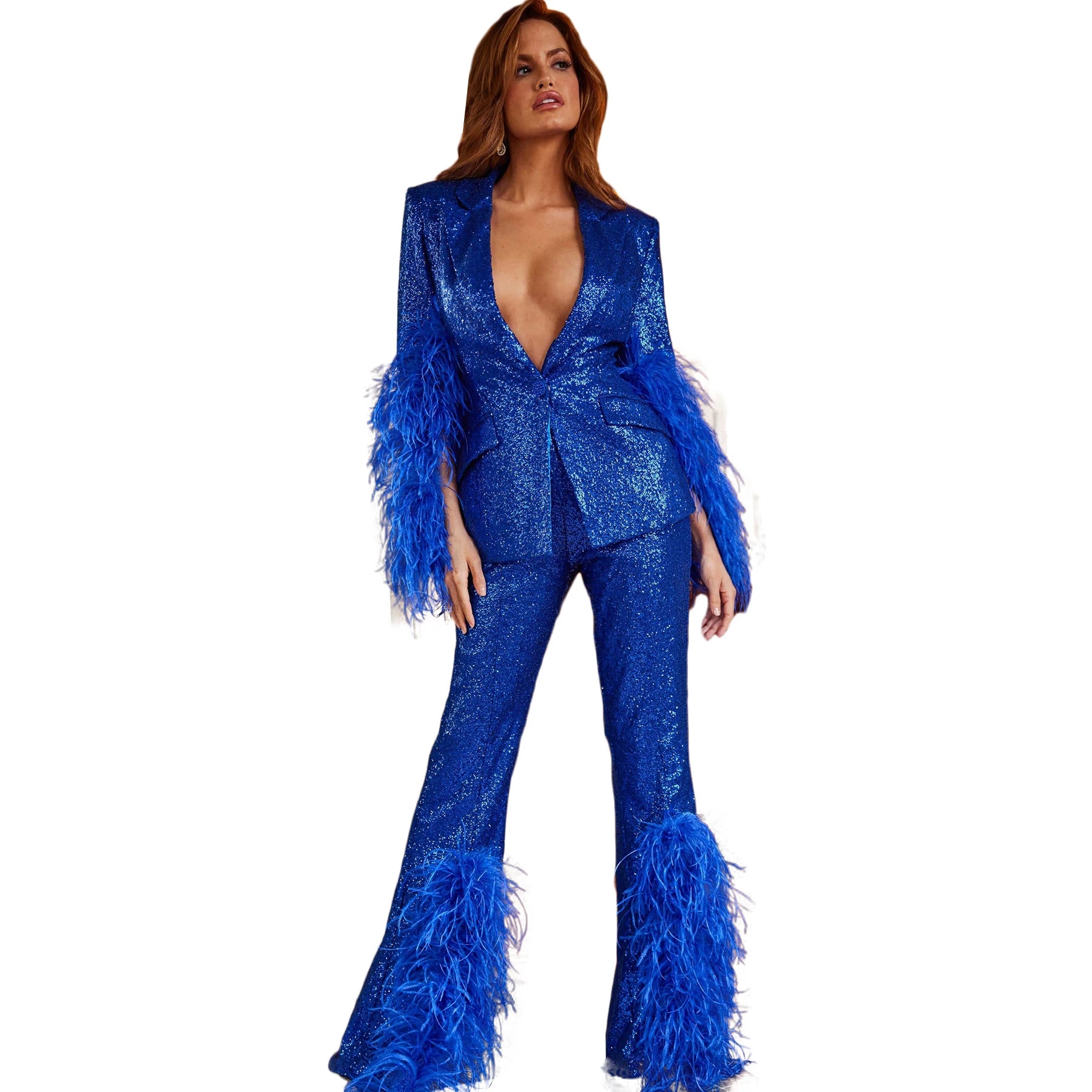 Vestidos azul real de 2 piezas con lentejuelas y plumas, chaqueta con escote en V profundo, para fiesta de graduación, formal, a medida