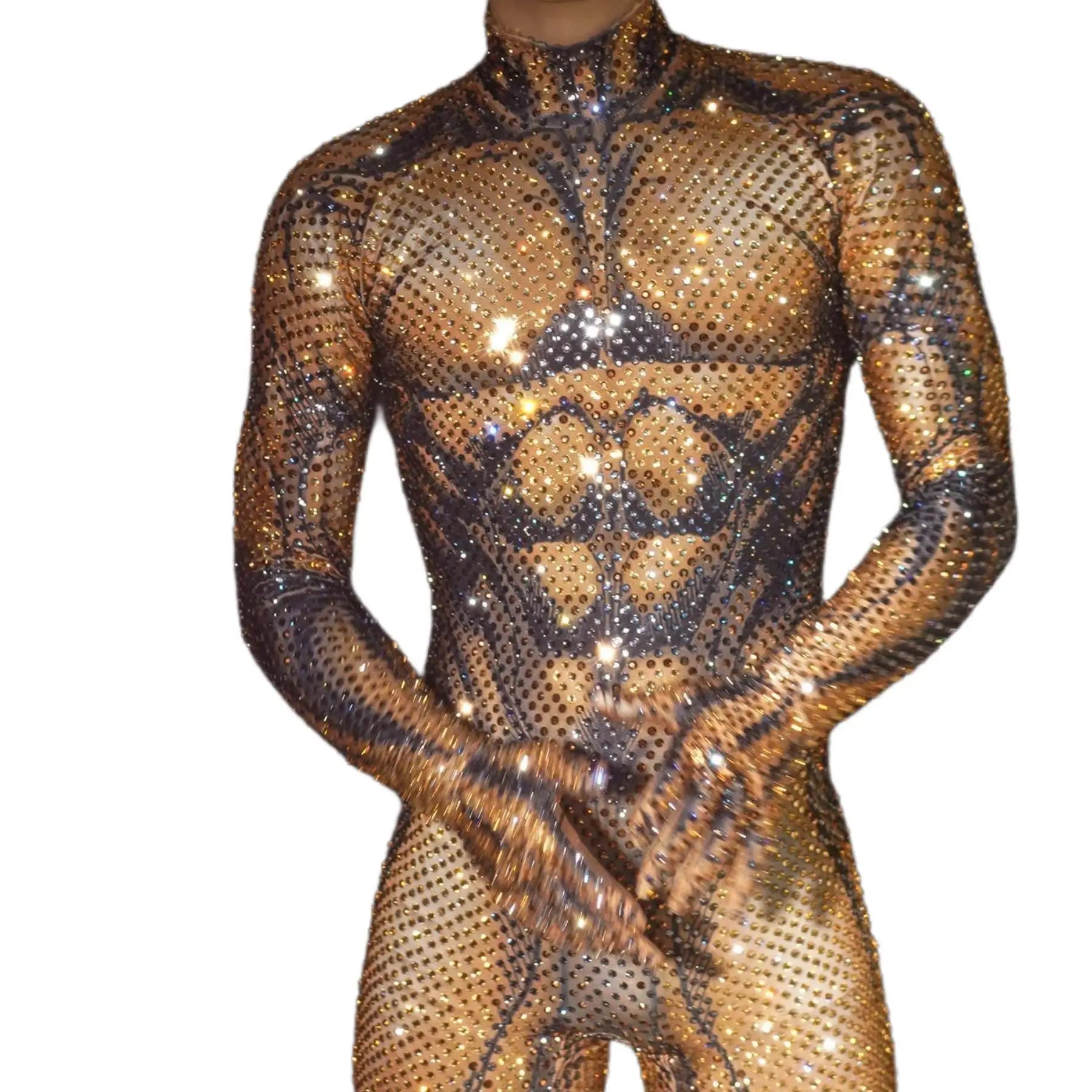 Sexy Blue Full Rhinestones Stretch Men Dance Jumpsuit Prom Dancer Singer Costume Evening Birthday Show Leggings Outfit