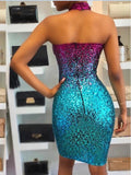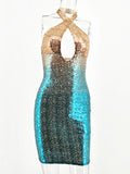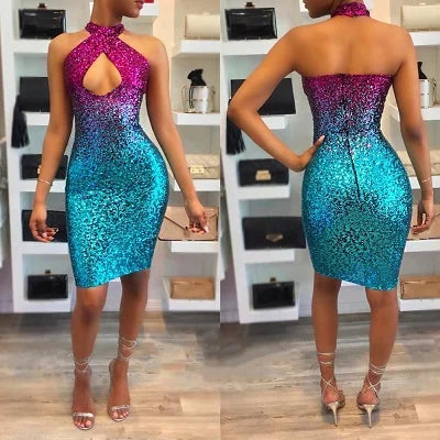 Light up the night in this Sexy Chic Summer Dress, featuring dazzling gold and red sequins in a bold, multi-color design. With a striking cross halter neckline and a sultry backless, sleeveless cut, this bodycon dress hugs your curves and ensures all eyes are on you. Perfect for club nights, parties, or any celebration where you want to stand out, this show-stopping piece combines glamour with confident, modern style.