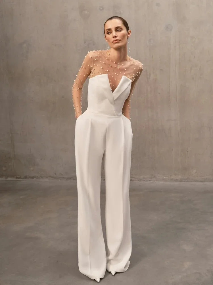 Conjunto de dos piezas formado por mono y mono sin tirantes, de malla con cuentas de perlas y mangas largas, color blanco, para mujer, para noche y pasarela.