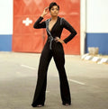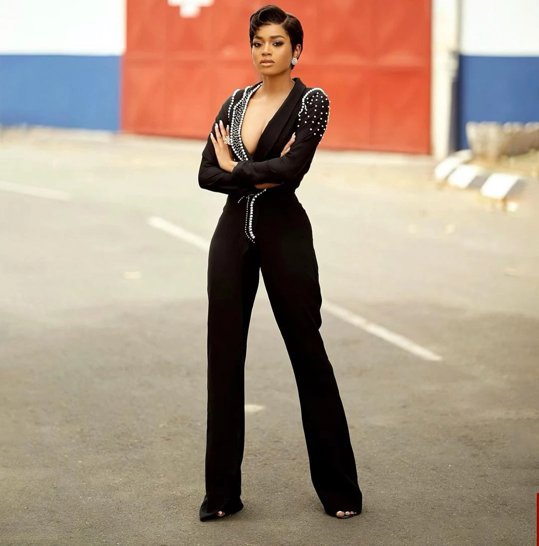 Vestidos de perlas sexys de lujo negros de 2 piezas con escote en V profundo, monos elegantes para fiesta de graduación formal