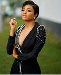 Este elegante conjunto es perfecto para fiestas de graduación, eventos formales y ocasiones especiales donde quieras destacar. El profundo escote en V le da un toque de encanto, mientras que las perlas aportan una sensación de lujo y glamour. Destaca con confianza y gracia con este exquisito atuendo que irradia elegancia y sofisticación. Ya sea para un evento formal o una celebración especial, este conjunto te hará sentir como una auténtica icono de la moda.