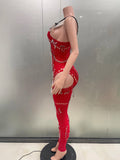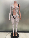 Sexy Shining Pearl Chain One Shoulder Hollow Out Jumpsuit New Women Birthday Party Nightclub Singer Performance Stage Wear