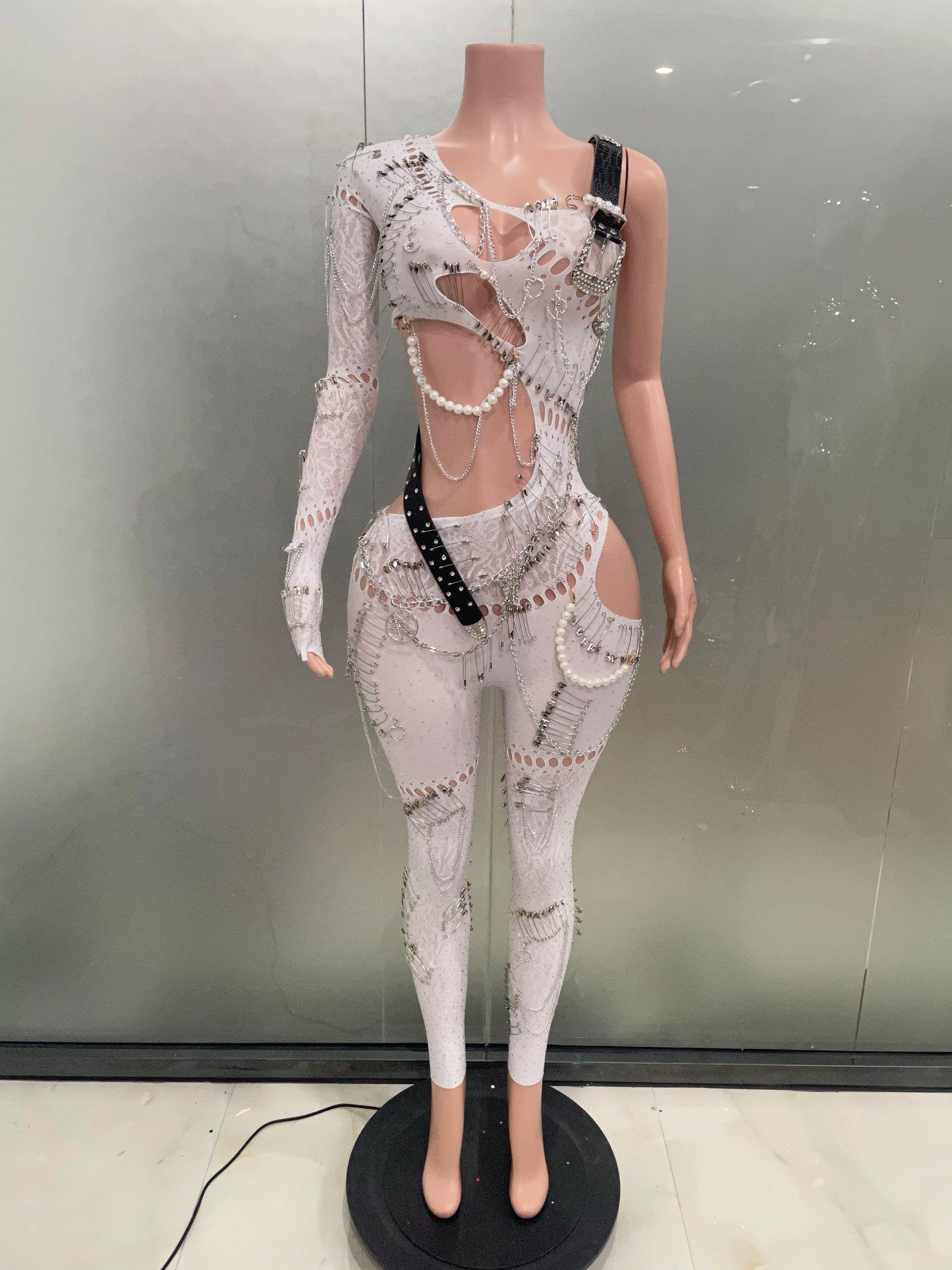 Turn heads at your next event in this stunning one-shoulder jumpsuit, featuring a shimmering pearl chain detail and a stylish hollow-out design. Perfect for birthdays, parties, or nightclub outings, this glamorous outfit ensures you'll shine all night long. Ideal for performers and anyone looking to stand out on stage or on the dance floor.
