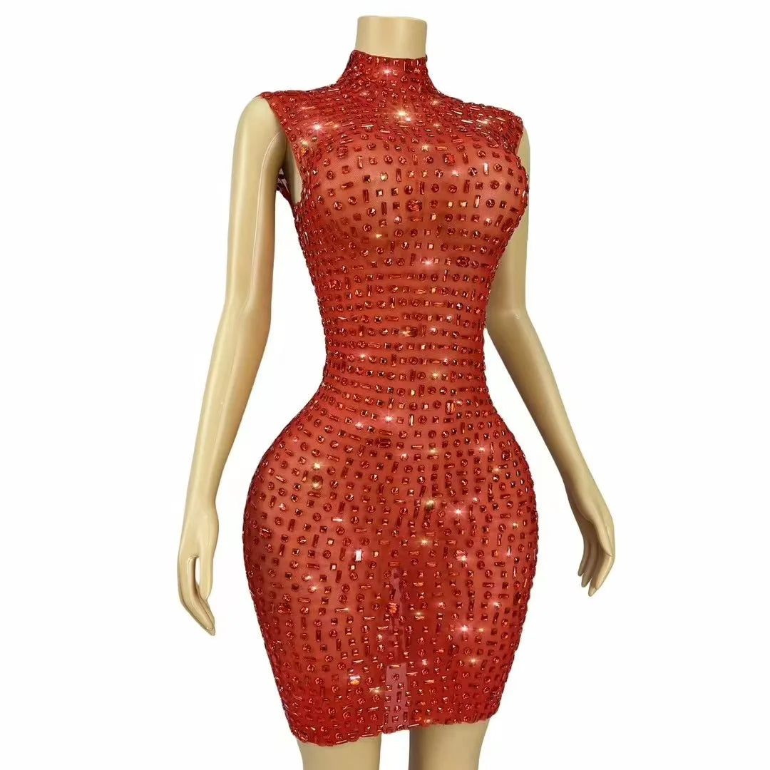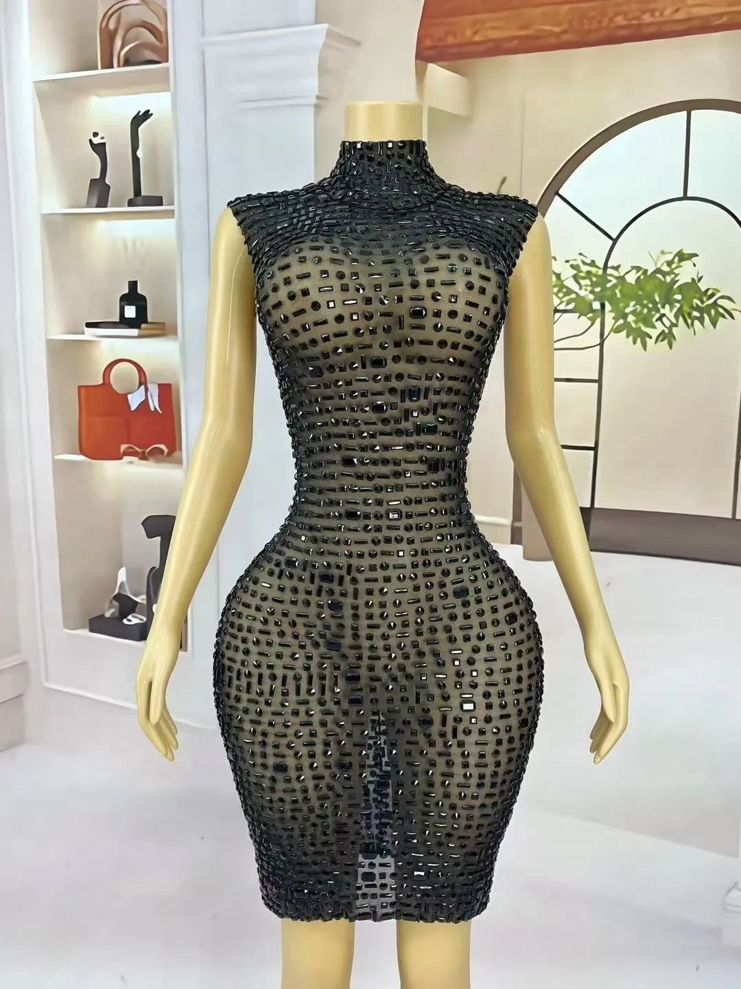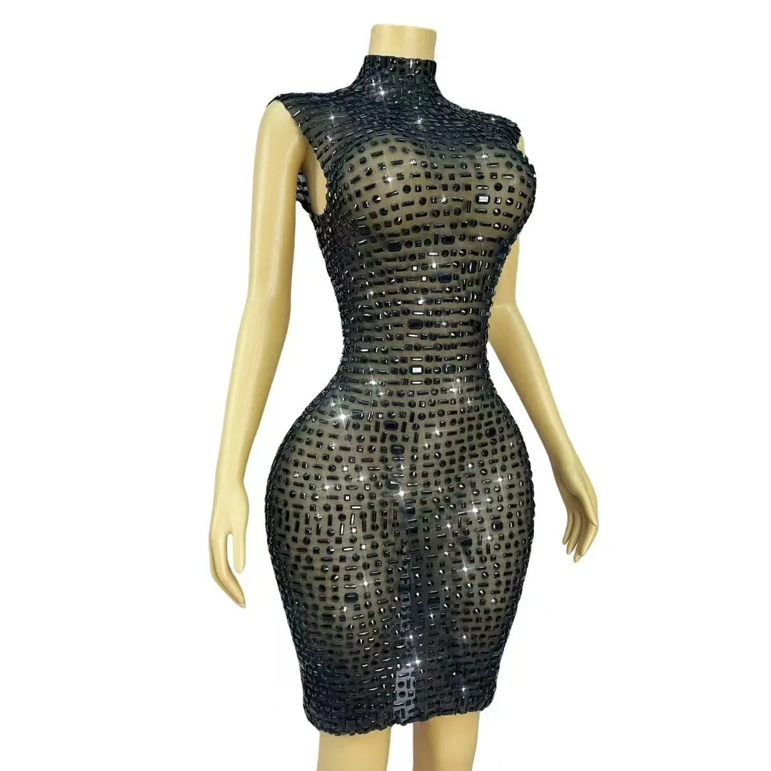 Turn heads and own the room in this Sexy Shiny Full Black Rhinestones Transparent Mesh Dress—an unapologetically glamorous piece designed for women who want to celebrate, seduce, and shine. Crafted from sheer, high-quality black mesh that flatters every curve, this dress blends delicate transparency with bold embellishment: the entire silhouette is lavishly covered in sparkling black rhinestones that catch and reflect light with every movement, creating a mesmerizing, jewel-like shimmer perfect for birthday nights, evening cocktail parties, VIP events, or nightclub dancing.