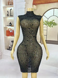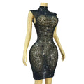 Sexy Shiny Full Black Rhinestones Transparent Mesh Dress Women Birthday Evening Cocktail Party Elegant Outfit Nighclub Costume