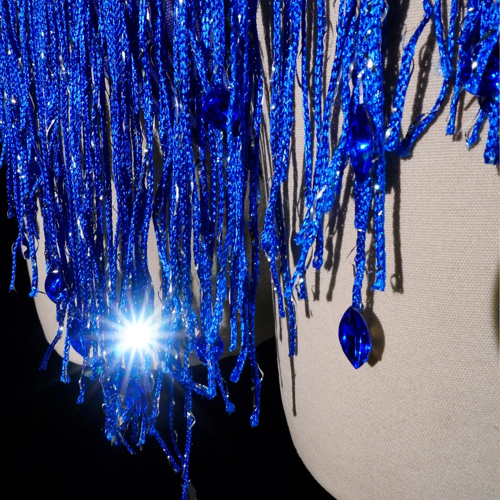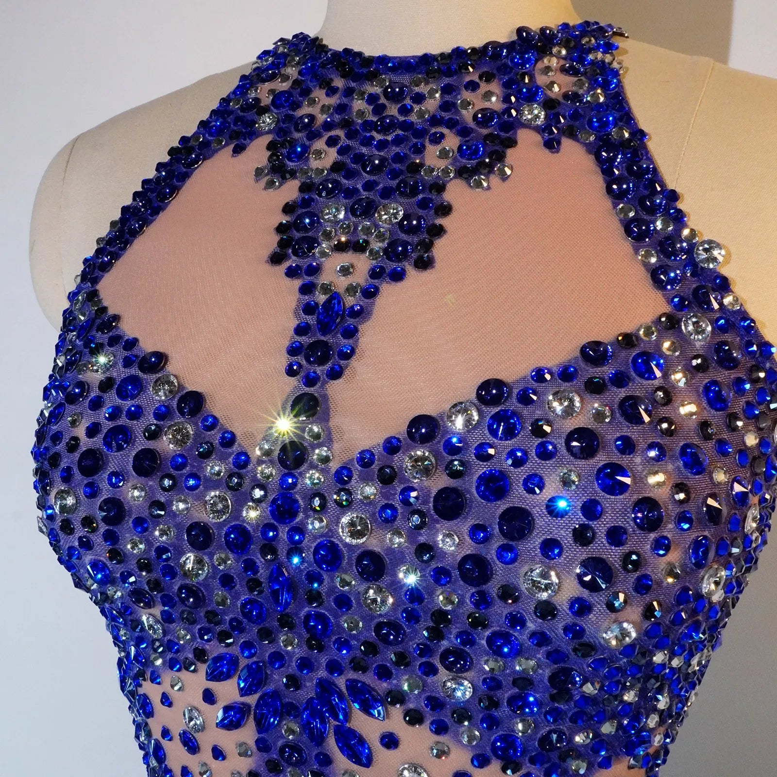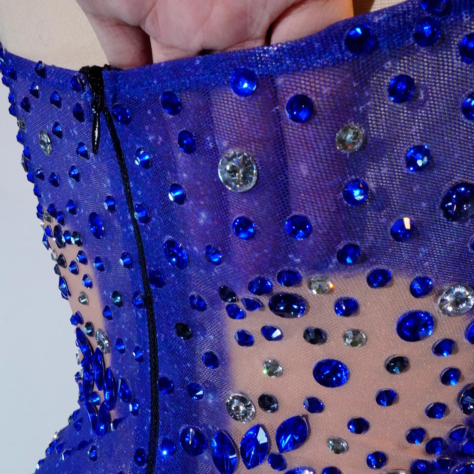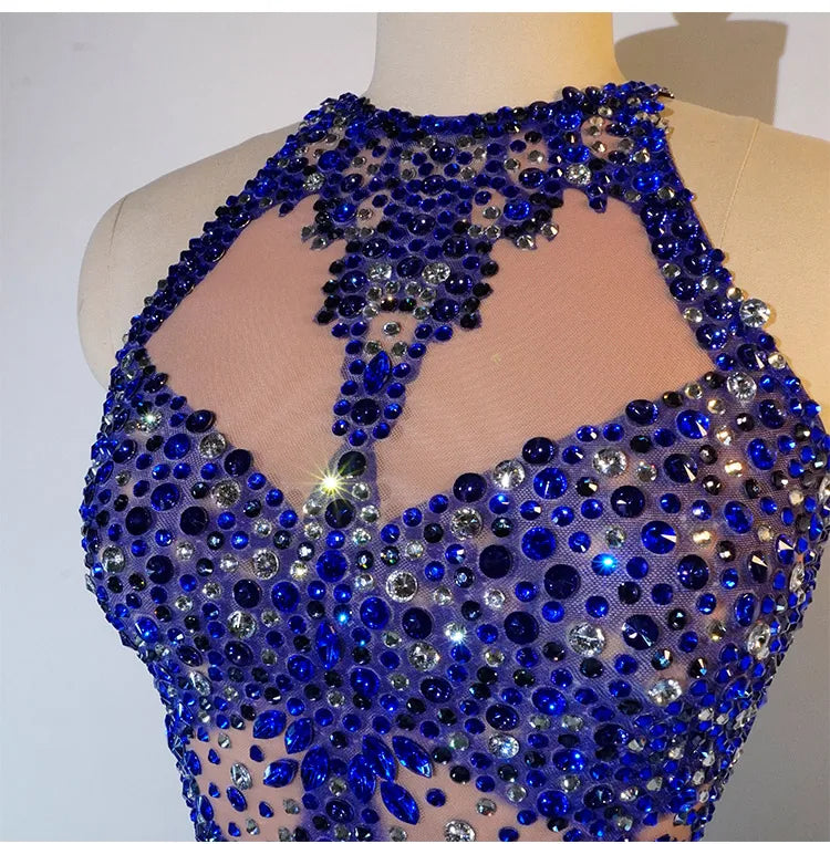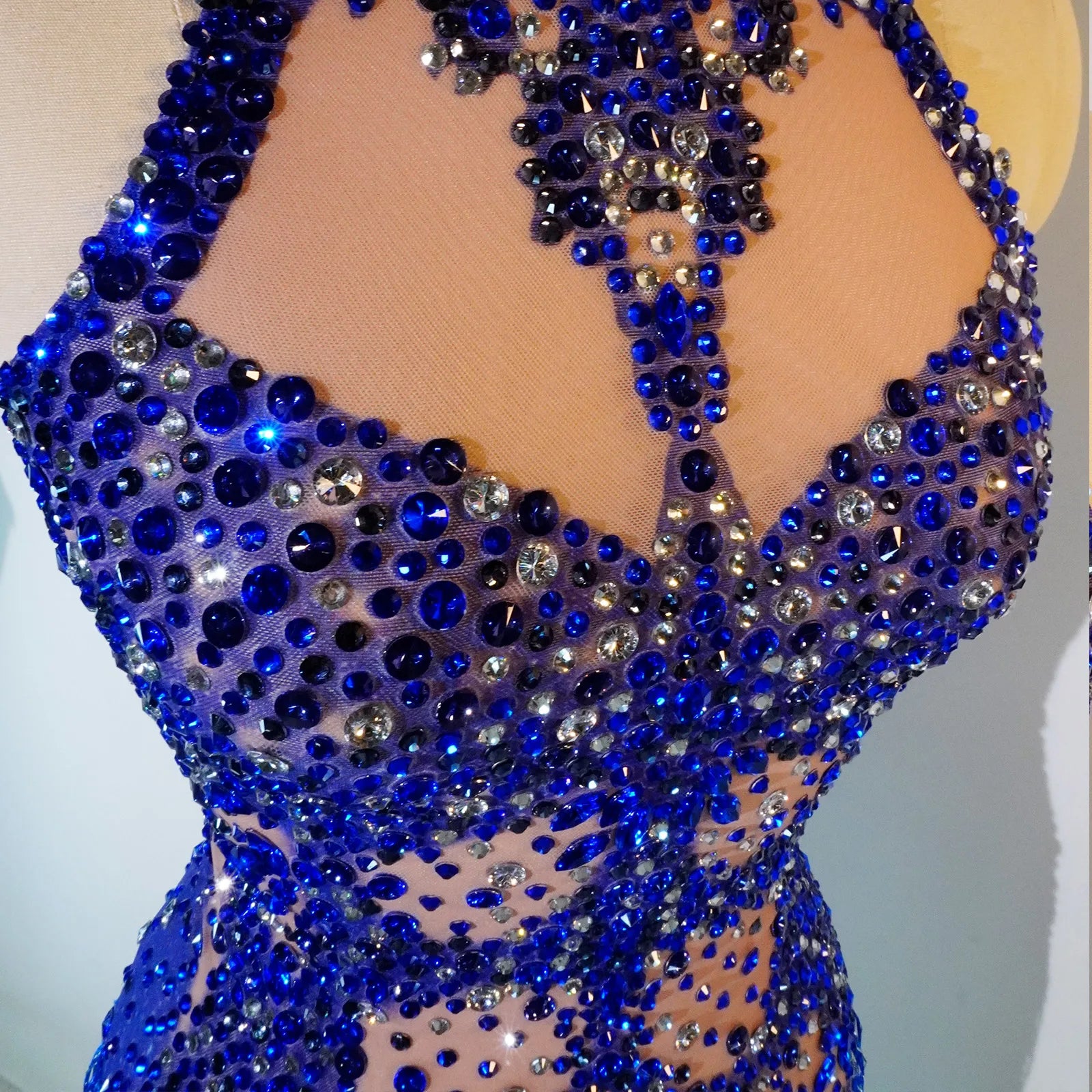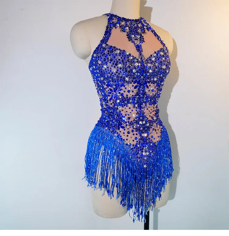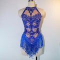 Sexy Skinny Women Dance Costume Sparkly Blue Rhinestones Fringes Bodysuit Leotard Singer Dancer Show Stage Wear Queen Nightclub