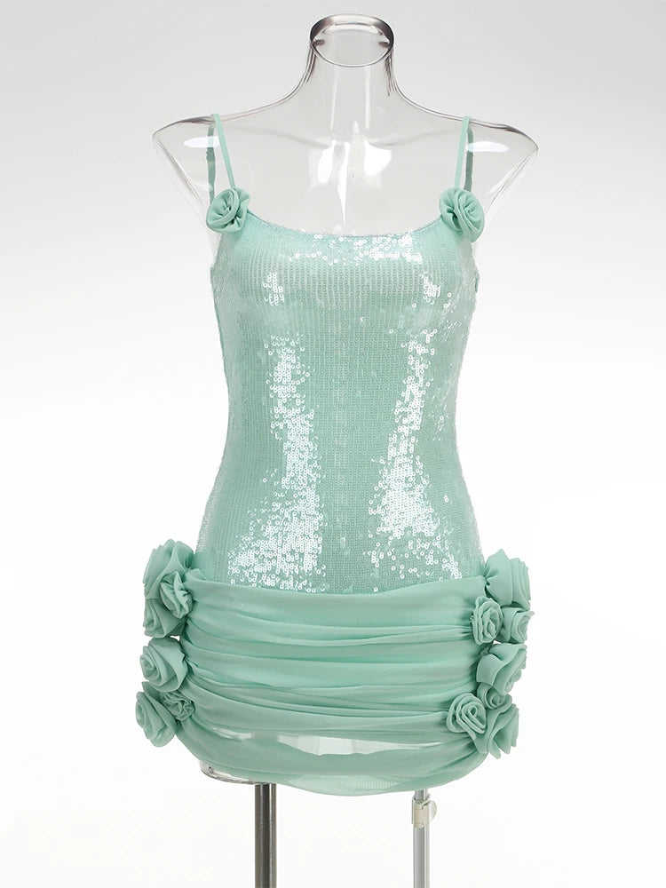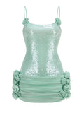 Shine at your next event in this sexy spaghetti strap backless mini dress, designed for women who love luxury and elegance. Adorned with sparkling sequins and delicate floral accents, this pleated dress features a flattering lace-up back for a custom fit. Perfect for summer proms, parties, or special occasions, this elegant gown will make you the center of attention with its glamorous, eye-catching style