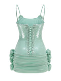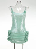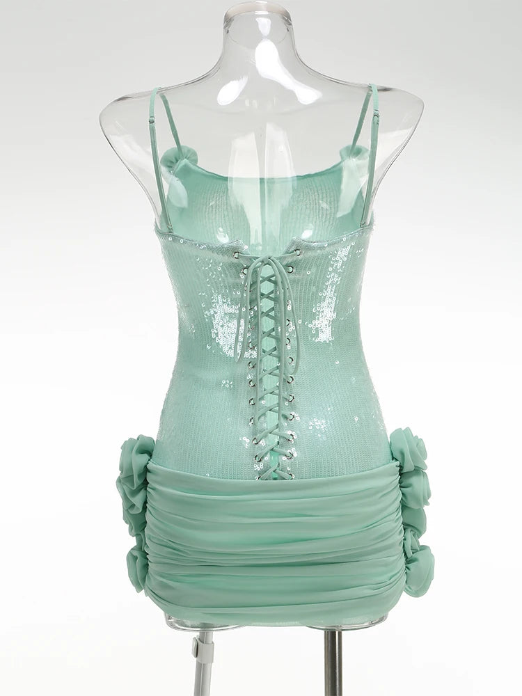 Sexy Spaghetti Strap Backless Prom Dresses for Women Luxury Summer Sequins Flower Lace-up Pleated Mini Dress Elegant Gowns