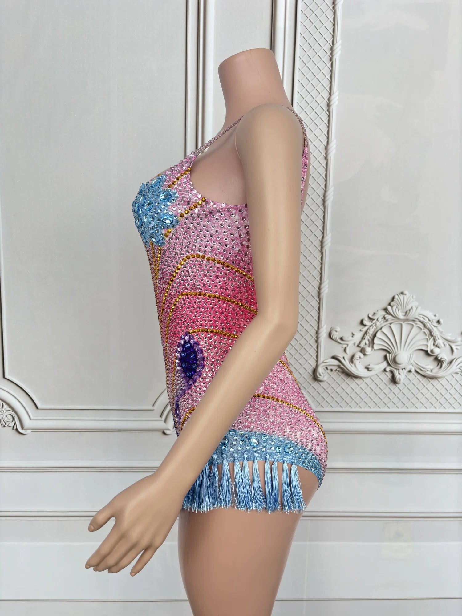 Elevate your stage presence with this Sexy Stage Rhinestone Bodysuit — a high‑glamour, performance‑ready piece crafted for gogo dancers, club performers, ravers, birthday celebrants, and anyone who wants to shine under lights. Combining dense rhinestone embellishments, playful fringe, and a sculpting bodysuit silhouette, this outfit is built to move, sparkle, and photograph beautifully.