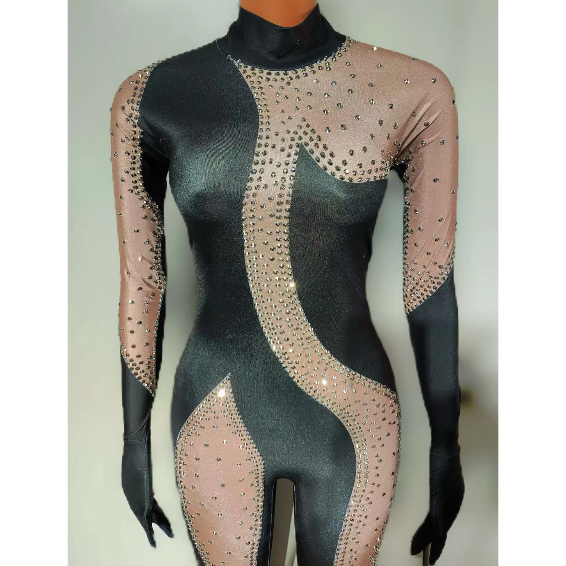 Sexy Stage Sparkly Rhinestones Jumpsuit Luxury Women One Piece Sheer Spandex Dance Drag Queen Costume Nightclub Stage Wear