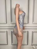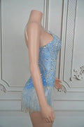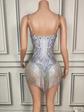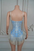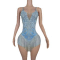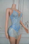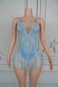 Sparkly Blue Silver Rhinestones Fringes Bodysuit Women Sexy Performance Dance Costume Nightclub Outfit Singer Dancer Stage Wear