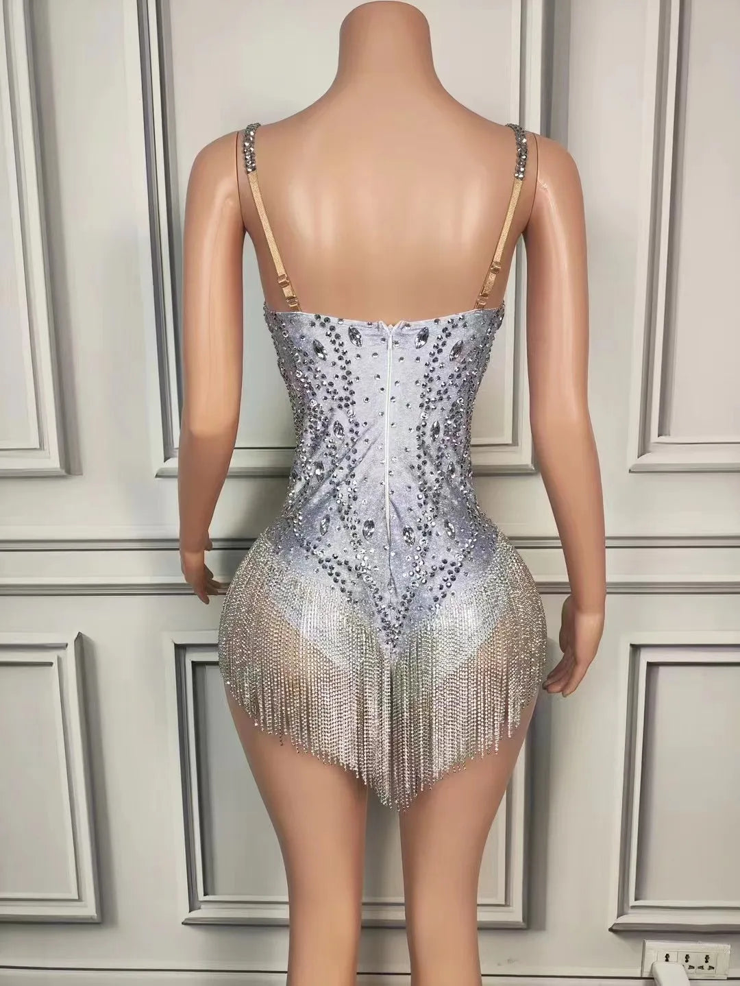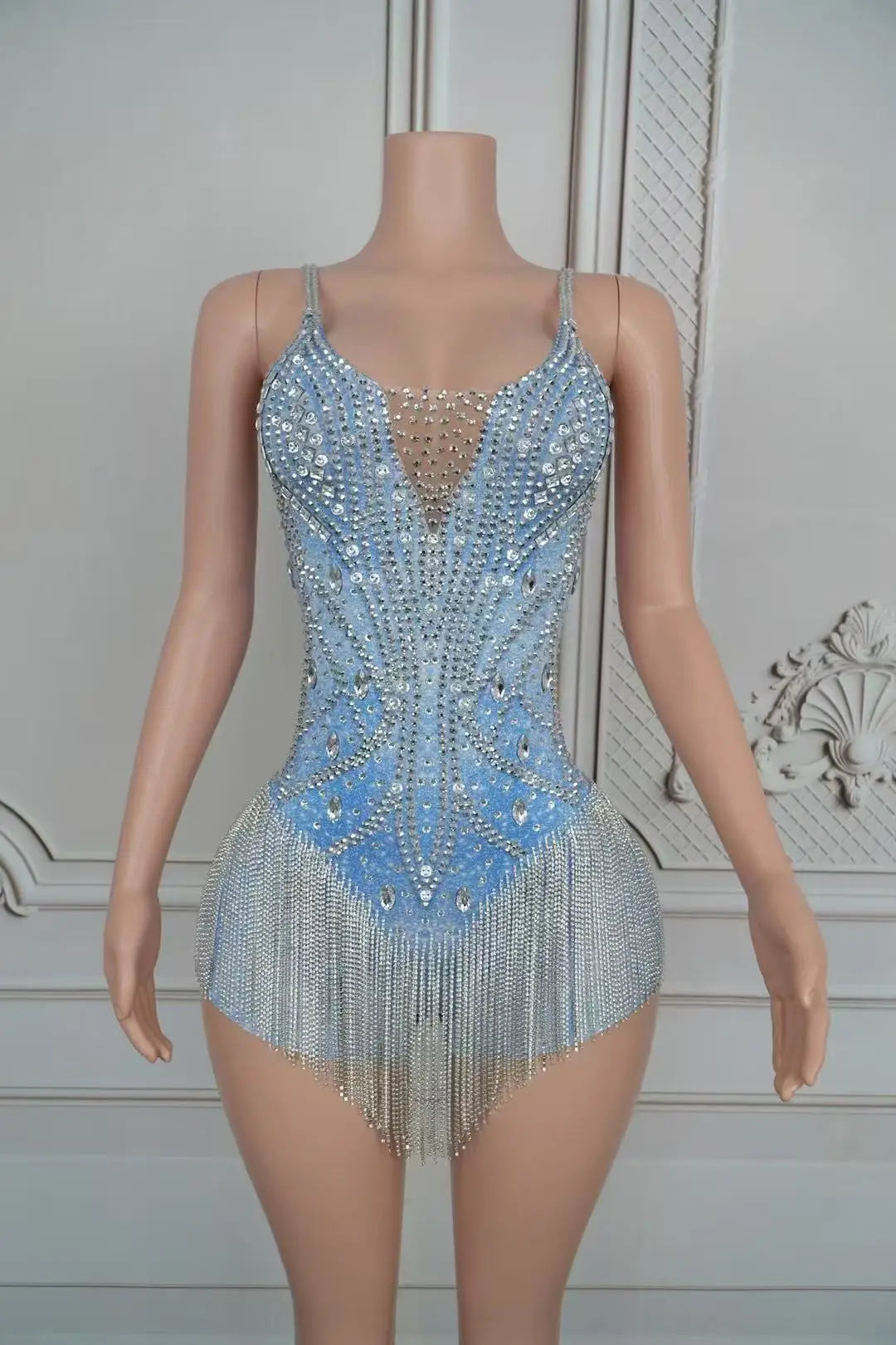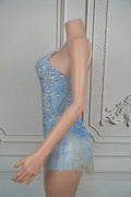 - Own the spotlight in this Sparkly Blue & Silver Rhinestones Fringes Bodysuit. Designed from stretch performance fabric, the bodysuit features dense blue and silver rhinestone embellishments across the bust and torso and layered fringe trims that swing with every move—perfect for singers, dancers, and nightlife performers. Functional details include reinforced seams, hidden crotch snaps, optional built‑in cups, and a soft lined gusset for comfort during long sets and photoshoots.