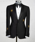 Elegante traje negro de dos piezas para hombre con detalles de cuentas doradas. Blazer y pantalón a medida para bailes de graduación, bodas y eventos formales. Tallas grandes disponibles.
