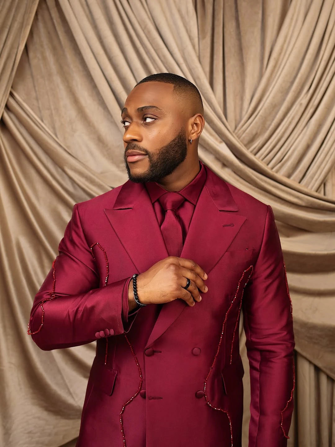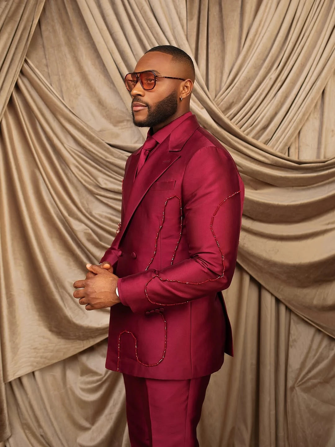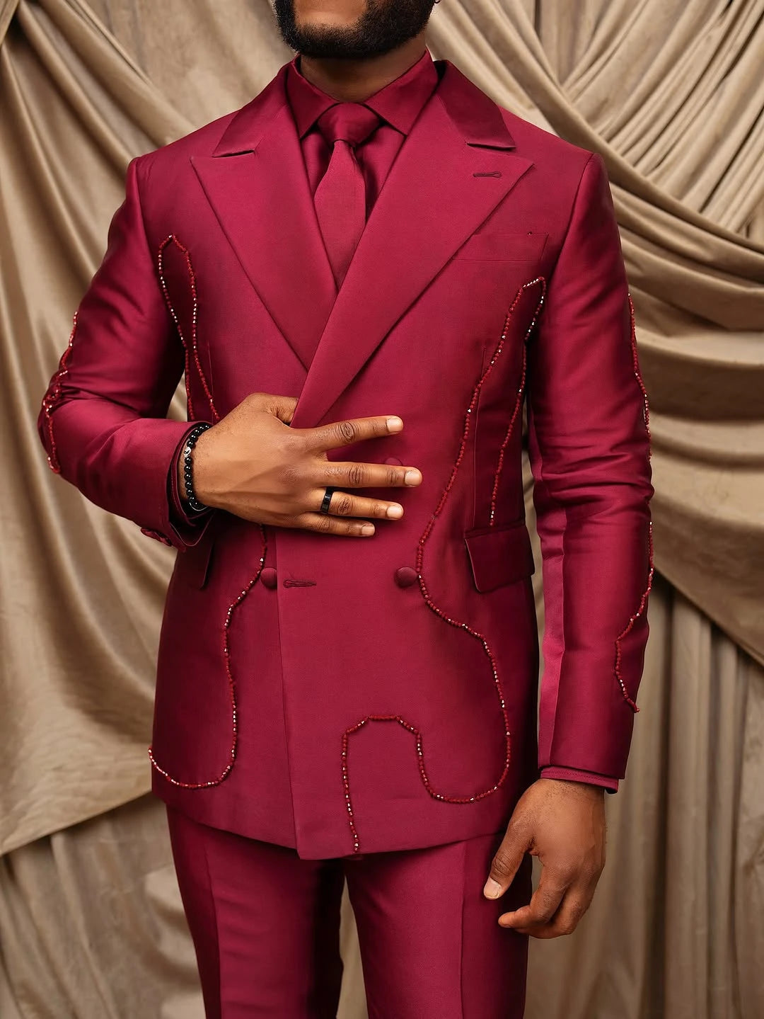 Stylish Men Suits Peaked Lapel Beading Blazer Tailor-Made 2 Pieces Set Jacket Double Breasted Groom Customized Coat Pants