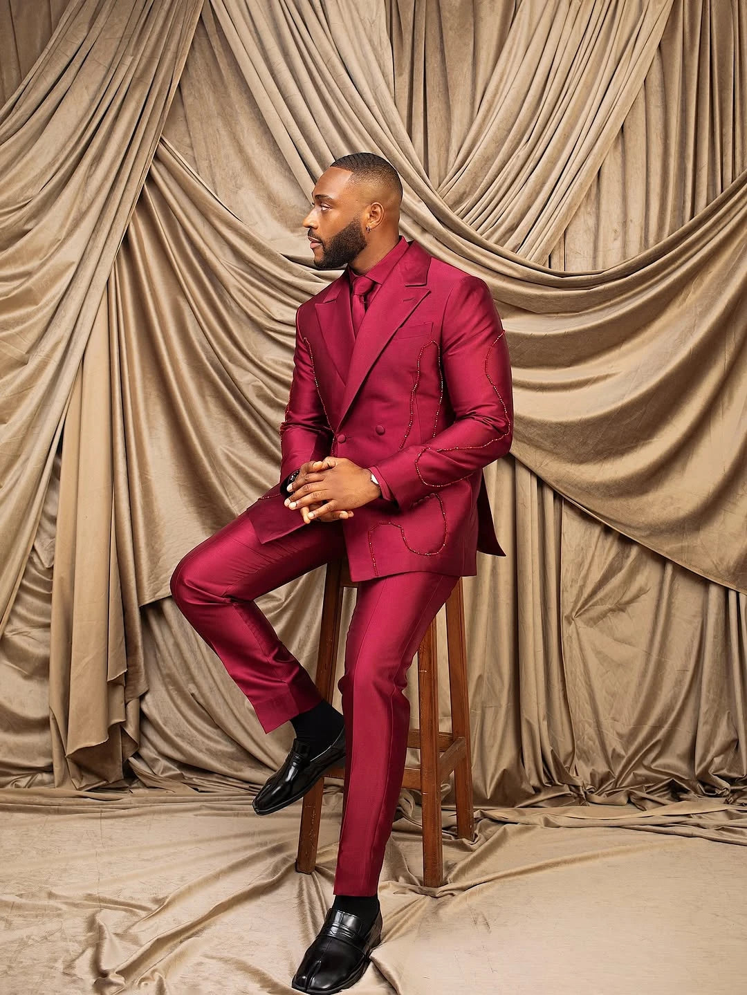Make a bold, refined entrance with this stylish tailor-made 2-piece men’s suit, expertly designed for grooms, evening events, red-carpet moments, and anyone who values couture-level tailoring with artisanal detail. This bespoke set features a double-breasted blazer with a striking peaked lapel and a pair of impeccably cut trousers — all crafted to your exact measurements for a flawless, confidence-boosting fit