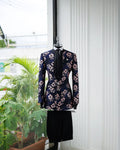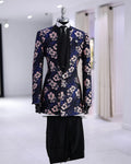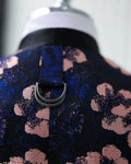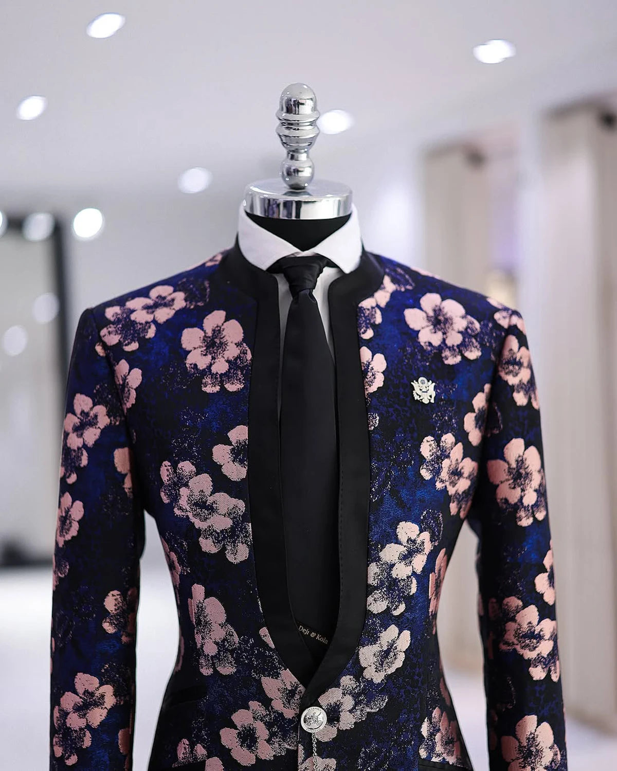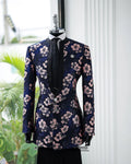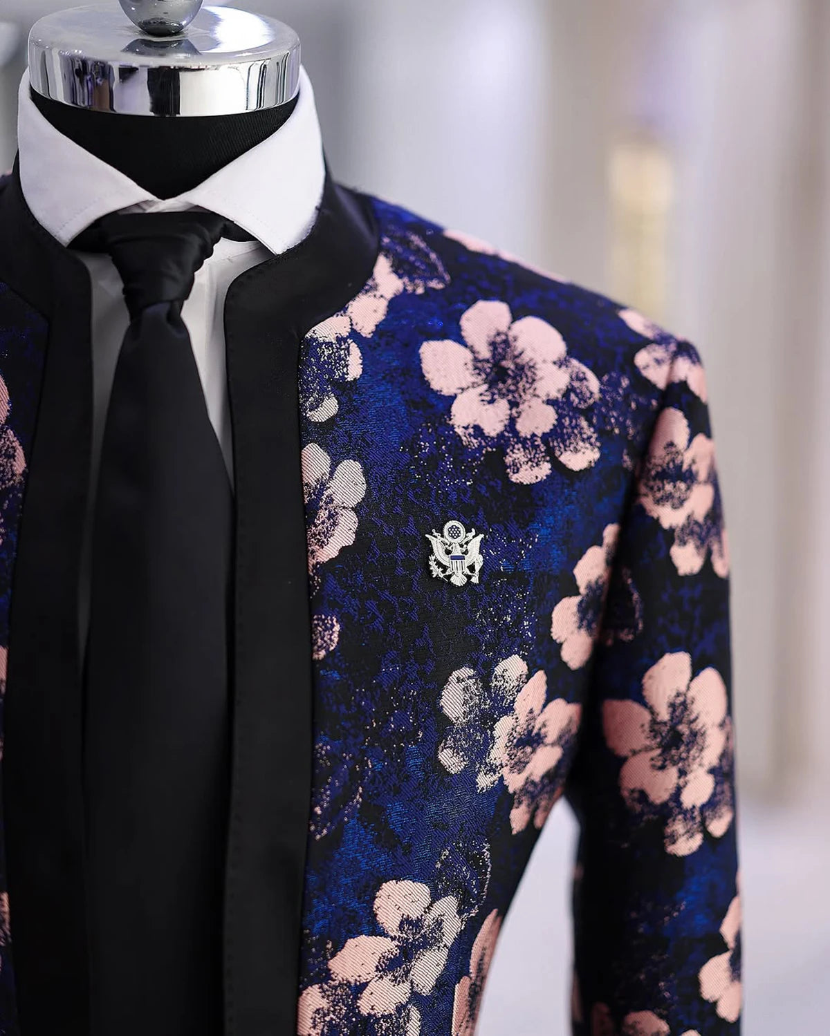 Present a distinguished, modern wedding or formal look with this Stylish Men Suits tailor‑made two‑piece set. The ensemble pairs a clean, one‑button jacket with a classic standard (notch) lapel and subtle floral detailing, matched to tailored black pants for a timeless, versatile groom outfit.