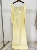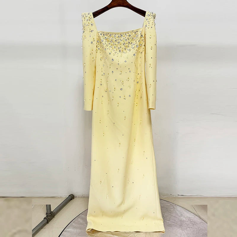 Fashion Designer Vestido Women's Square Collar Beading Diamonds Long Sleeve Maxi Dress