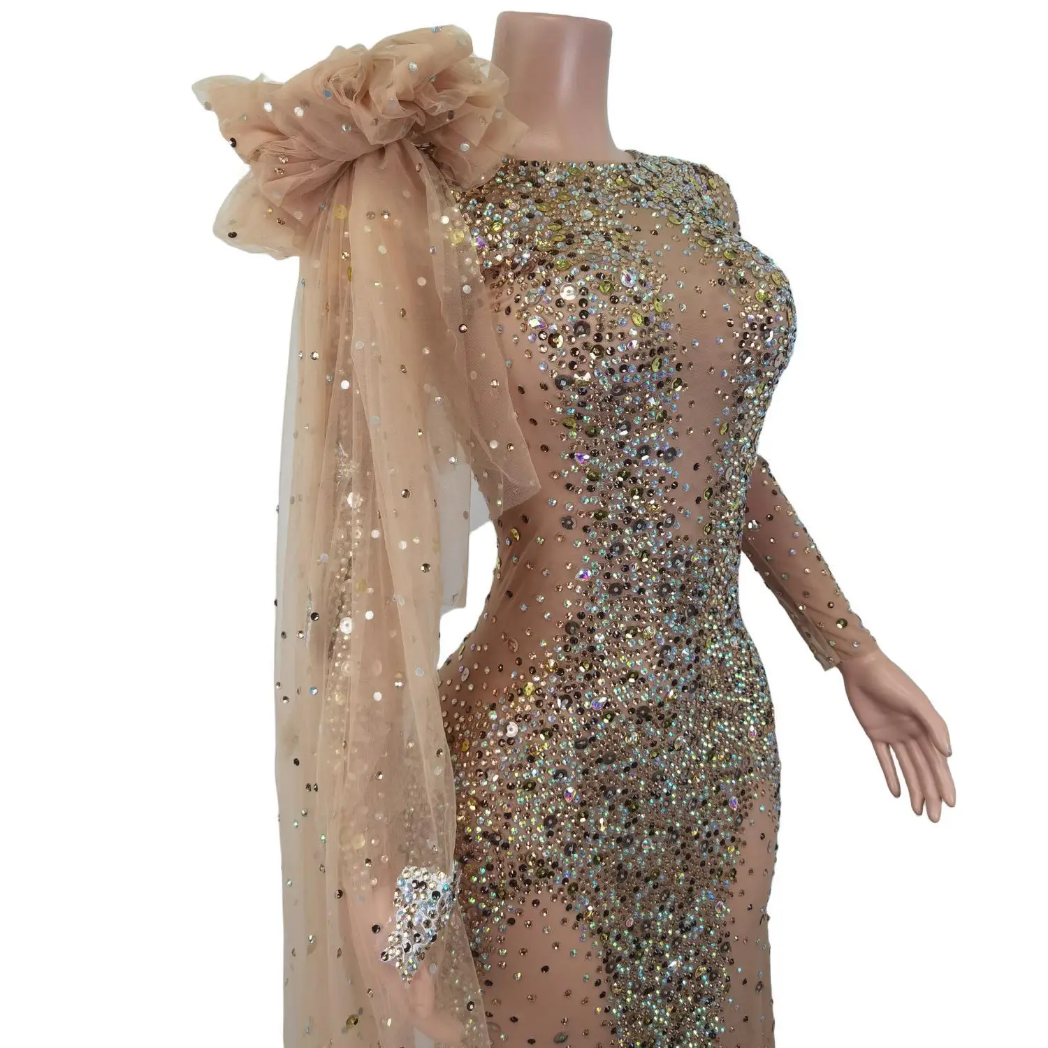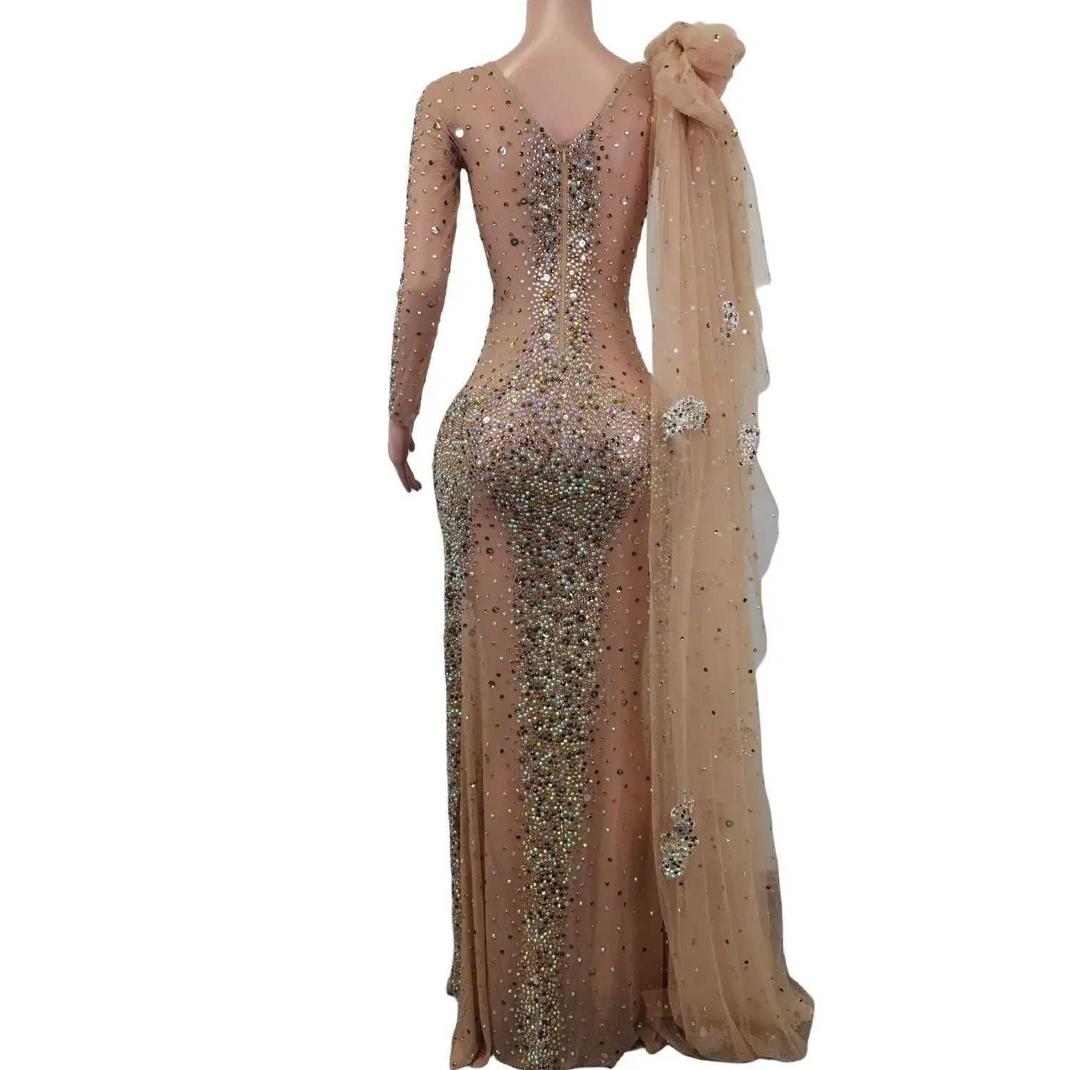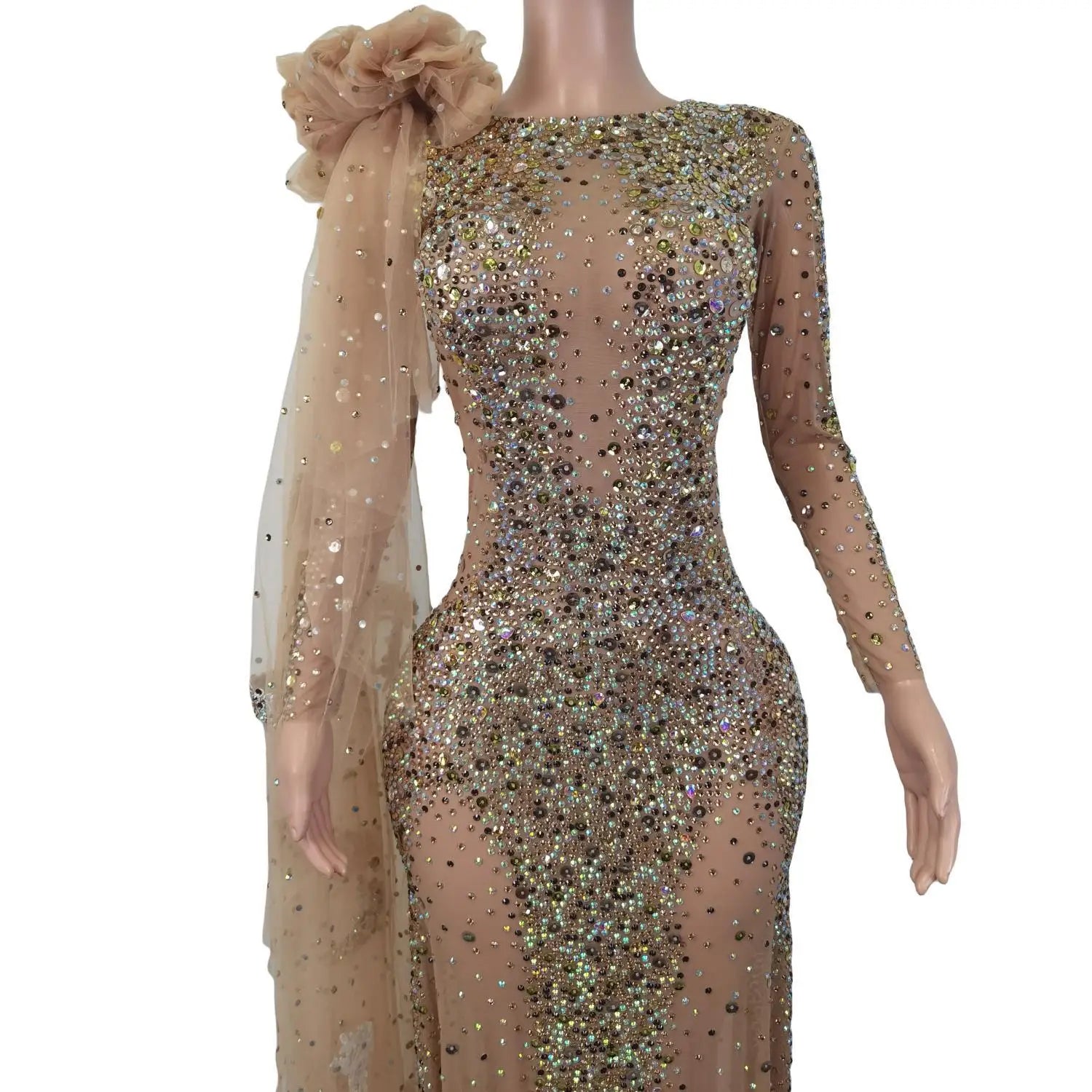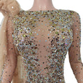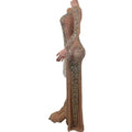 Elegante vestido largo de manga larga con cristales transparentes para mujer, ideal para bodas, bailes de graduación y eventos formales.