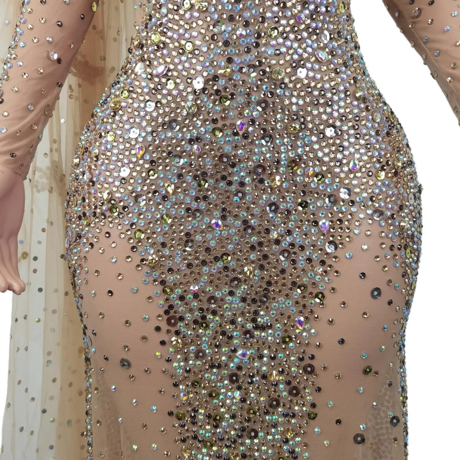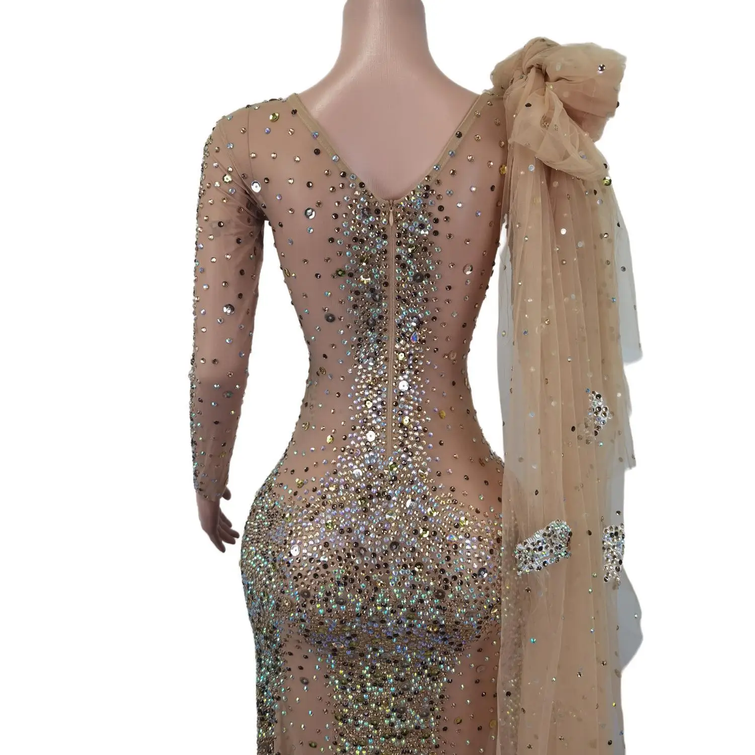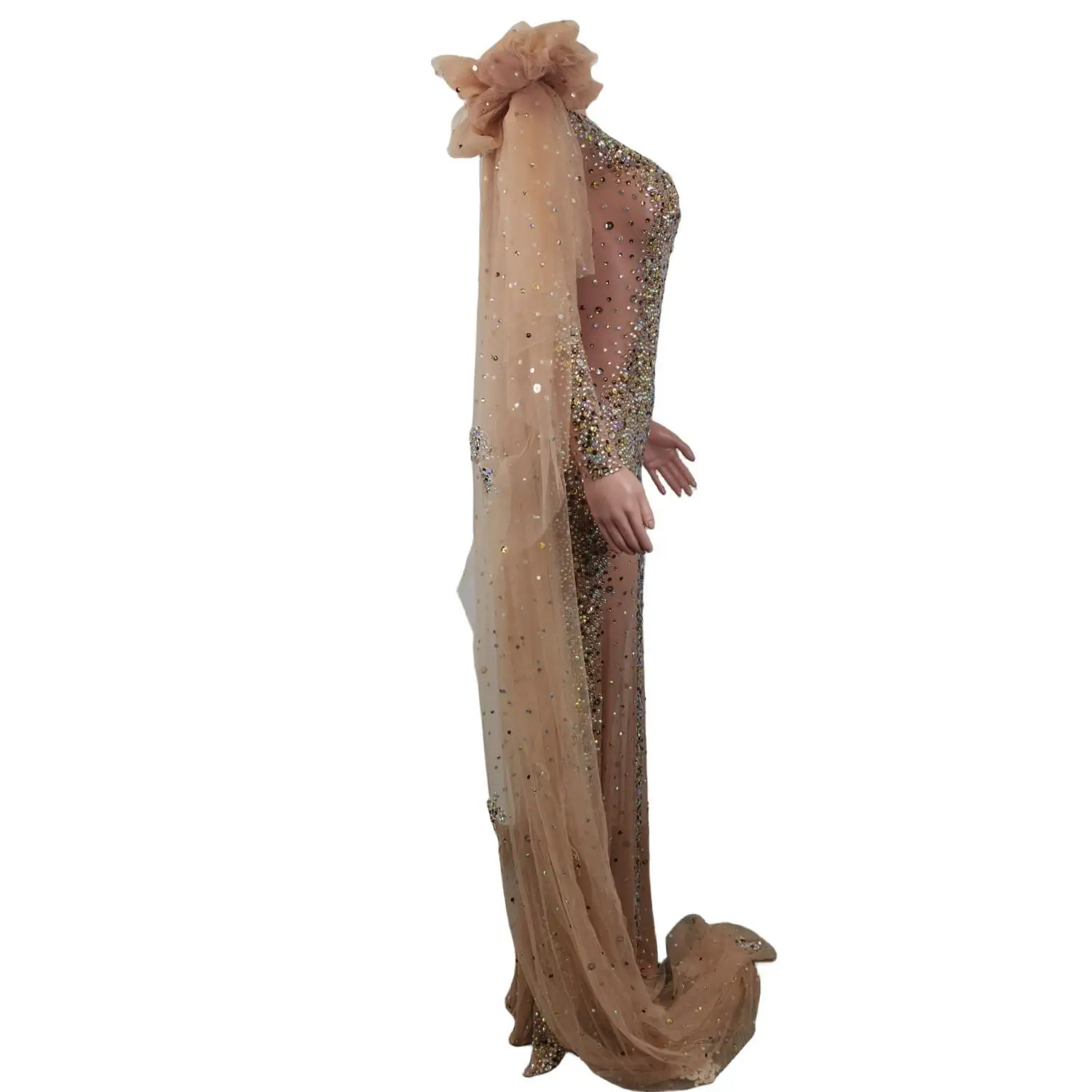 Elegante vestido largo de manga larga con cristales transparentes para mujer, ideal para bodas, bailes de graduación y eventos formales.