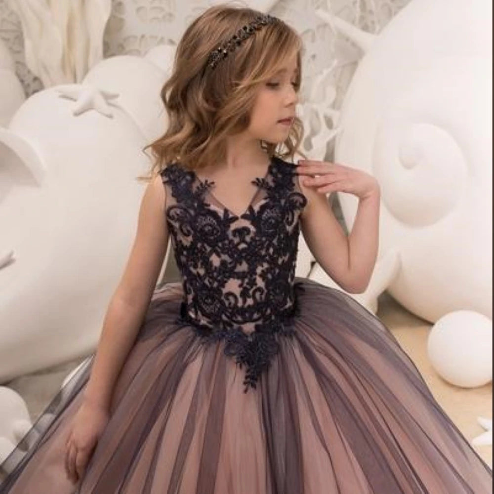 Vestido de fiesta elegante de tul y encaje hasta el suelo para niñas con apliques