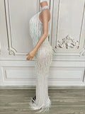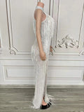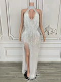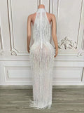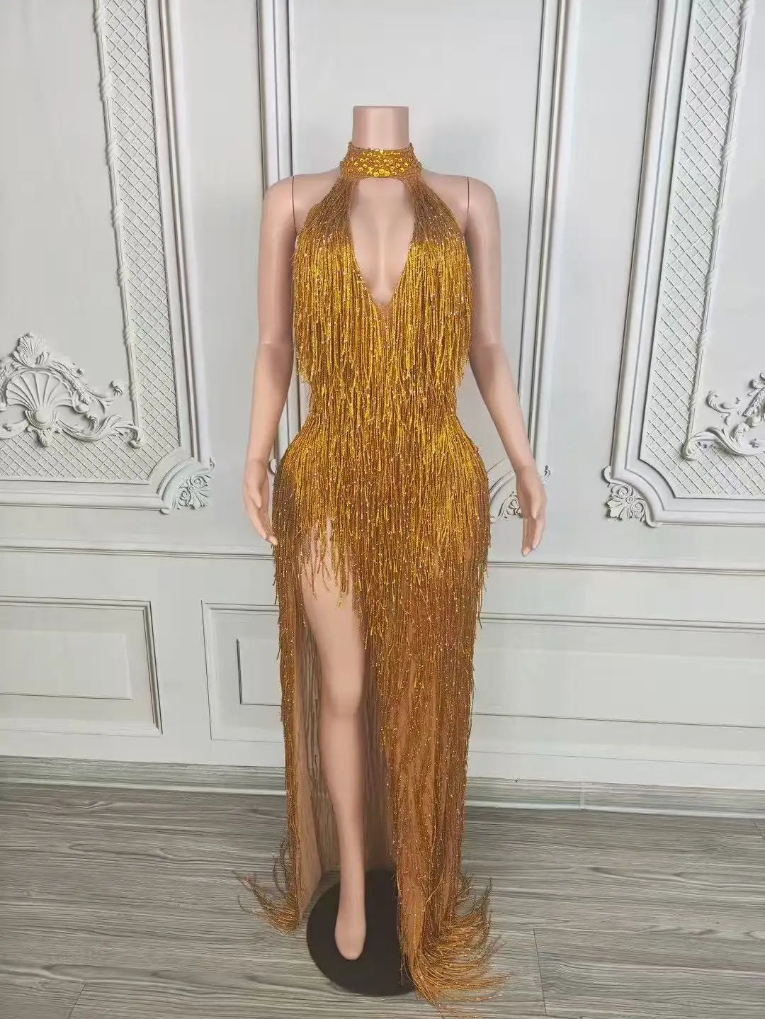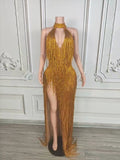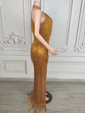 Women Sexy Shiny Gold Crystals Tassel Luxury Long Dress Elegant Prom Gown Evening Club Birthday Wedding Party Singer Stage Dress