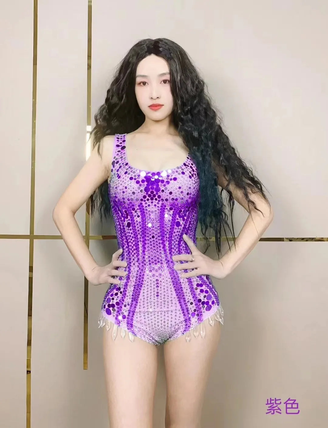 - Shine in every spotlight with this Women Sexy Stage Purple Rhinestones Sequins Leotard. Crafted from stretch performance fabric, the leotard is densely decorated with purple sequins and hand‑applied rhinestones across the bust and torso to amplify stage lighting. Built for movement, it features reinforced seams, a lined gusset, and secure closures (back zipper or snap crotch) so performers can dance, sing, and pose with confidence. Variants include long sleeve, halter, or sleeveless options and high‑cut or moderate‑cut legs.