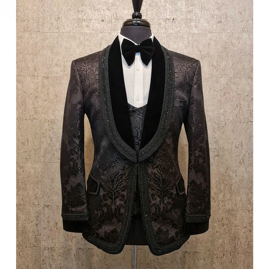 Costume 3 pièces en jacquard noir avec perles et perles pour homme, ensemble veste, gilet et pantalon, style décontracté et élégant.