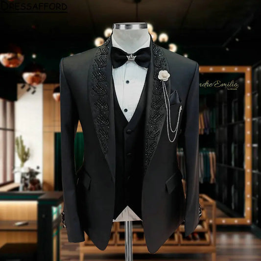 Costume 3 pièces pour homme, élégant et décontracté, avec perles noires, pour soirée, mariage, smoking