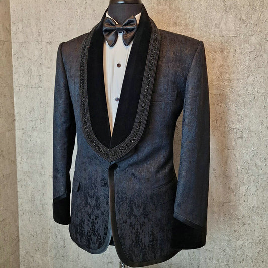 Costume deux pièces en jacquard noir avec perles pour homme, blazer de soirée (veste + pantalon)