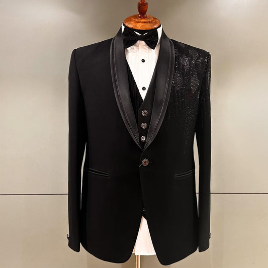 Blazers noirs pour hommes, costumes à paillettes et perles, mode banquet, 3 pièces, veste d'affaires, gilet, pantalon